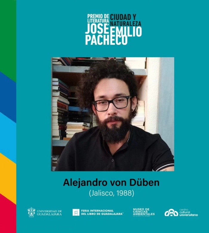 “Por su sentido de la tensión narrativa y su excelente manejo de la prosa” un jurado integrado por Socorro Venegas, Liliana Blum y Octavio Escobar concedió de manera unánime el Premio de Literatura Ciudad y Naturaleza José Emilio Pacheco al escritor jalisciense Alejandro von Düben por su obra En todo cuerpo hay vacío. La ceremonia de premiación se realizará el próximo 2 de diciembre, durante la edición 37 de la Feria Internacional del Libro de Guadalajara.La obra que presentó von Düben bajo el seudónimo Éter fue seleccionada entre 138 propuestas literarias de 20 países, por “la capacidad para vincular naturaleza y ciudad sin obviedades y sin perjudicar la estructura de los cuentos, profundizando en la psicología de los personajes y en los conflictos de un mundo amenazante”, se lee en el acta resolutiva del jurado, firmada el 27 de septiembre pasado.Alejandro von Düben (Chapala, 1988) es licenciado en Letras Hispánicas por la Universidad de Guadalajara y actualmente estudia la maestría en Literatura Hispanoamericana en la Benemérita Universidad Autónoma de Puebla. Es autor de Dar a luz, Los poemas de la noche insomne, 20 poemas para construir una casa, Palabras como de otro mundo y Clara como un fantasma. Entre los premios que ha recibido se encuentran el Nacional de Poesía Francisco González León, el Internacional de Poesía Infantil FOEM y el Nacional de Novela Juvenil “Universo de Letras”.Emocionado, el autor originario de Chapala se dijo agradecido con la convocatoria de este concurso y consideró que “es necesario tomar este tipo de temáticas [del medio ambiente con la literatura], pero hacerlo de un modo que tampoco se pierda lo literario”. Lo anterior, lo declaró tras la llamada del jurado para anunciarle que había obtenido la octava edición del Premio, que este año estuvo dedicado al cuento.El Premio de Literatura Ciudad y Naturaleza José Emilio Pacheco fue creado en memoria del escritor mexicano como un espacio para incentivar la creación literaria y la apreciación estética de la naturaleza. Es convocado por la Universidad de Guadalajara, mediante el Museo de Ciencias Ambientales del Centro Cultural Universitario, en colaboración con la FIL Guadalajara. En sus ocho ediciones han participado más de un millar de obras de todo el orbe y de toda la república mexicana.La primera edición del Premio fue recibida ex aequo por los poetas mexicanos León Plascencia Ñol y Jorge Gutiérrez Reyna. La segunda edición fue para la argentina Brenda Becette, por su colección de cuentos La parte profunda. El venezolano Santiago Acosta, con su poemario El próximo desierto, fue acreedor al galardón en su tercera edición. La cuarta edición recayó en la narradora mexicana Claudia Cabrera Espinosa, por Posibilidad de los mundos. El poeta mexicano Marco Antonio Rodríguez Murillo obtuvo el Premio en su quinta edición por Tal vez el crecimiento de un jardín sea la única forma en que los muertos pueden hablarnos. La sexta edición fue premiada Una ciudad para el fin del mundo, del mexicano Oswaldo Hernández Trujillo. El poeta salvadoreño Jorge Galán fue el ganador de la séptima edición del Premio, con Equinoccio.MM