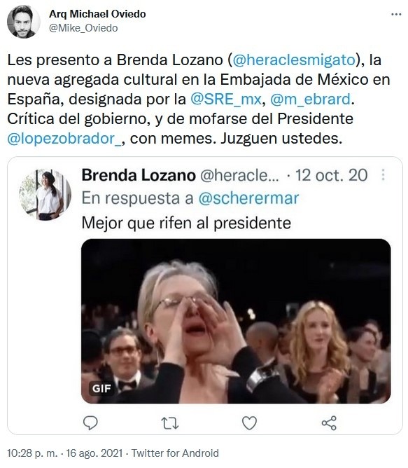 Funcionarios y seguidores del Presidente Andrés Manuel López Obrador criticaron el nombramiento de la escritora y feminista Brenda Lozano, quien ayer lunes fue designada por la Secretaría de Relaciones Exteriores, a cargo del canciller Marcelo Ebrard, como la nueva agregada cultural de la Embajada de México en España.Lozano, quien sucede al autor Jorge F. Hernández tras su polémica dimisión entre acusaciones de misoginia y choques con el Gobierno, fue acusada en redes sociales de haber emitido críticas en el pasado contra López Obrador.La escritora está en la polémica y es tendencia en Twitter porque seguidores y funcionarios de la 4T han reproducido algunas de las críticas que hizo contra la administración y el Mandatario, en el pasado, en su cuenta personal.Pedro Salmerón, director del Museo Regional de Guadalajara, publicó esta mañana un hilo en Twitter donde cuestiona la decisión de Ebrard y del director de Diplomacia Cultural, Enrique Márquez, al designar a Brenda Lozano, a quien califica de integrante de "las mafias de escritores".Salmerón señala: "Y es que de verdad, no puede menos que indignarnos que se designe para un cargo tan representativo, a alguien que ha insultado soez y sistemáticamente al nuevo gobierno, a su titular, a su esposa, como ha hecho @heraclesmigato (Brenda Lozano), como lo muestra en un nutrido hilo @sevillacritico".Seguidores de AMLO consideraron un "error garrafal" del canciller haber nombrado agregada cultural a una "antiobradorista" y cuestionaron la congruencia de Brenda Lozano por haber aceptado el encargo. Incluso compartieron memes publicados por la escritora y presionaron para que renuncie a través del "hashtag" "#RenunciaBrendaLozano".Algunos echaron a andar consultas: "¿Cree que Brenda Lozano merece que le regalen un cargo como agregada cultural en España después de burlarse varias veces del Presidente López Obrador? Sí, merece el regalo. No lo merece".También hay comentarios de apoyo a Brenda Lozano por su designación, la escritora Sandra Lorenzano escribió: "¡Felicidades, querida @heraclesmigato!! ¡Qué orgullo!", Pablo Rendón escribe: "Ojalá tanta polémica gratuita alrededor del nombramiento de Brenda Lozano como agregada cultural en España sirva, también, para que su obra llegue a más lectores. Una de las voces más interesantes dentro de la nueva narrativa mexicana, sin duda. Lo demás es puro ruido".En tanto, León Krauze dijo: "Hace muchos (demasiados) años, tuve el privilegio de que @heraclesmigato fuera mi alumna en un taller de revistas. Inteligente, sensible, creativa... ¡Qué suerte tiene la Embajada de México en España! Felicidades, Brenda." Y la actriz Claudia Ramírez, dijo: "Hacen TT a Brenda Lozano porque no piensa como ellos, los retrógradas, tan evidentes como siempre… felicidades". Si te interesó esta noticia y quieres saber más, entonces descarga y descubre INFORMAPlus, la aplicación digital de EL INFORMADOR, en donde tenemos contenidos exclusivos, seleccionados por nuestros editores, para darles una experiencia más completa a los lectores. Descarga la aplicación y pruébala GRATIS por treinta días. Para iOS: https://apple.co/35jaVgbPara Android: https://bit.ly/3gwVSEVSi eres suscriptor de EL INFORMADOR tu acceso está incluido, solicítalo al 33 3678-7777IM