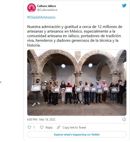 Para celebrar el Día de las y los Artesanos, este sábado 19 de marzo la Secretaría de Cultura de Jalisco (SC) llevó a cabo una jornada de actividades en el Centro Cultural Patio de los Ángeles, en la que sobresalieron la entrega del reconocimiento “Roberto Montenegro” a mujeres y hombres que han dedicado su vida a la elaboración de artesanías, y la apertura de la exposición “Hecho con el Corazón”, una muestra de piezas elaboradas con técnicas representativas de diversas regiones del estado, a lo que se sumó la realización de un taller para niñas y niños.En estos términos, en el recinto cultural del barrio de Analco comenzaron las actividades con el taller “Mi juguete de madera”, impartido por el investigador Carlos Hernández, donde tomaron parte 50 niñas y niños cuya propósito fue tallar y pintar un juguete de madera, para luego reflexionar acerca del valor de las artesanías, la técnica y el conocimiento que requiere su elaboración, así como su trascendencia en la historia del arte popular mexicano.Posteriormente, autoridades de la SC hicieron entrega del reconocimiento “Roberto Montenegro” –artista referente del arte popular mexicano– a 12 artesanas y artesanos de diferentes regiones de la entidad, por toda una vida entregada a la manufactura de artesanías con materiales y técnicas variadas que van desde la incrustación de madera, esgrafiado en hueso, tejido de tule, moldeado en cera y en hoja de maíz, tejido de ocochal, tallado en cantera, pita y bordado.Las y los artesanos reconocidos –procedentes de distintas regiones de Jalisco– son Alejandro Alfaro, Juan Manuel Águila, Pedro Mendoza, Elena Quezada, Flavio García, Luis Zermeño, Carmen Torres, Jesús Flores, Luciano Jacobo, Jorge Soriano, José Hernández y José Ascensión Juárez.Luego de eso, con la presencia de Lourdes González Pérez, titular de la SC, y la directora de Fomento Artesanal del Gabinete Económico, Margarita Alfaro, se inauguró la exposición “Hecho con el Corazón”, con 23 piezas de los creadores reconocidos y algunos más, donde se exhiben desde gabanes hasta cintos piteados y huaraches, y que podrá ser visitada en el lugar hasta el próximo 8 de abril.El Día de las Artesanas y los Artesanos se celebra el 19 de marzo, día en que también se recuerda a San José, quien tenía oficio de carpintero, una tarea artesanal como la de muchos mexicanos por quienes se preservan las tradiciones y costumbres.JM
