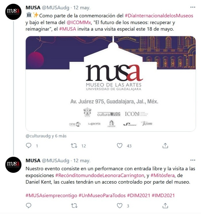 Desde el año de 1977, cada 18 de mayo se celebra el Día Internacional de los Museos, así lo estableció el Consejo Internacional de Museos (ICOM). Y este 2021, bajo el tema “El futuro de los museos: recuperar y reimaginar”, propuesto por la organización, es que el Museo de las Artes de la Universidad de Guadalajara (MUSA) se suma a los festejos, donde mostrará algunas piezas de su colección como no se han visto antes, según se explica en un comunicado de prensa.La actividad lúdica lleva por nombre “El museo más allá de sí” y es una colaboración con el grupo de performers “Arrogante Albino”, la cual dará inicio a las 19:30 horas y con la cual, a partir de la exploración de uno de los lugares más íntimos de este recinto, se detona una reflexión para reimaginar la relación del público con los espacios museísticos, se subraya.Así, “un infiltrado que ha logrado entrar a la bodega donde el museo guarda su colección, compartirá los detalles de algunas piezas a performers que se encargarán de transmitir esta experiencia a los visitantes”.Los componentes de dicha acción estarán presentes tanto en el interior del MUSA como extramuros y en ella, el testimonio narrativo a partir de lo sensorial se presenta como un punto de partida. Se destaca además que este proyecto hace patente la importancia de ampliar la reflexión museística desde lo íntimo, es decir, “desde los procesos que hacen posible las exhibiciones hasta la constancia del diálogo entre las áreas que conforman a un museo”.La actividad se realizará el 18 de mayo de 19:00 a 22:00 horas, tiempo en el que los visitantes podrán disfrutar también de las exposiciones “Recóndito mundo” de Leonora Carrington y “Mitósfera”, de Daniel Kent.JM