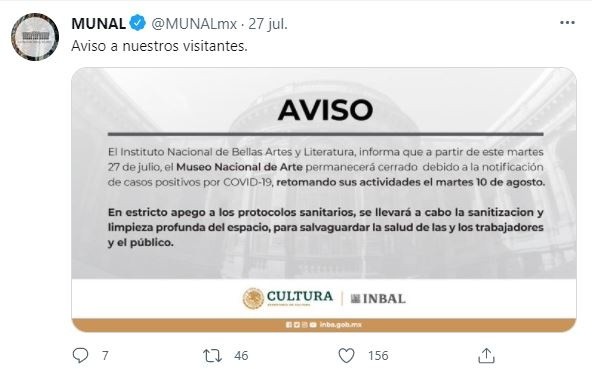 El Museo Nacional de Arte, MUNAL, a menos de una semana de que abrió al público la exposición "Símbolo y reino. Tres grandes colecciones novohispanas", debió cerrar sus puertas debido a varios casos positivos de COVID-19.El Instituto Nacional de Bellas Artes por medio de Twitter informó del cierre de la programación: "El Instituto Nacional de Bellas Artes y Literatura informa que a partir de este martes 27 de julio el Museo Nacional de Arte permanecerá cerrado debido a la notificación de casos positivos por Covid-19, retomando sus actividades el martes 10 de agosto. En estricto apego a los protocolos sanitarios se llevará a cabo la Sanitización y limpieza profunda del espacio para salvaguardar la salud de los trabajadores y las trabajadoras y el público".La institución no dio detalles de los casos que se presentaron. En septiembre de 2020, después de que había reabierto, el Munal debió cerrar nuevamente, también porque hubo casos de COVID-19.Si te interesó esta noticia y quieres saber más, entonces descarga y descubre INFORMAPlus, la aplicación digital de EL INFORMADOR, en donde tenemos contenidos exclusivos, seleccionados por nuestros editores, para darles una experiencia más completa a los lectores.Descarga la aplicación y pruébala GRATIS por treinta días.Para iOS: https://apple.co/35jaVgbPara Android: https://bit.ly/3gwVSEVMB