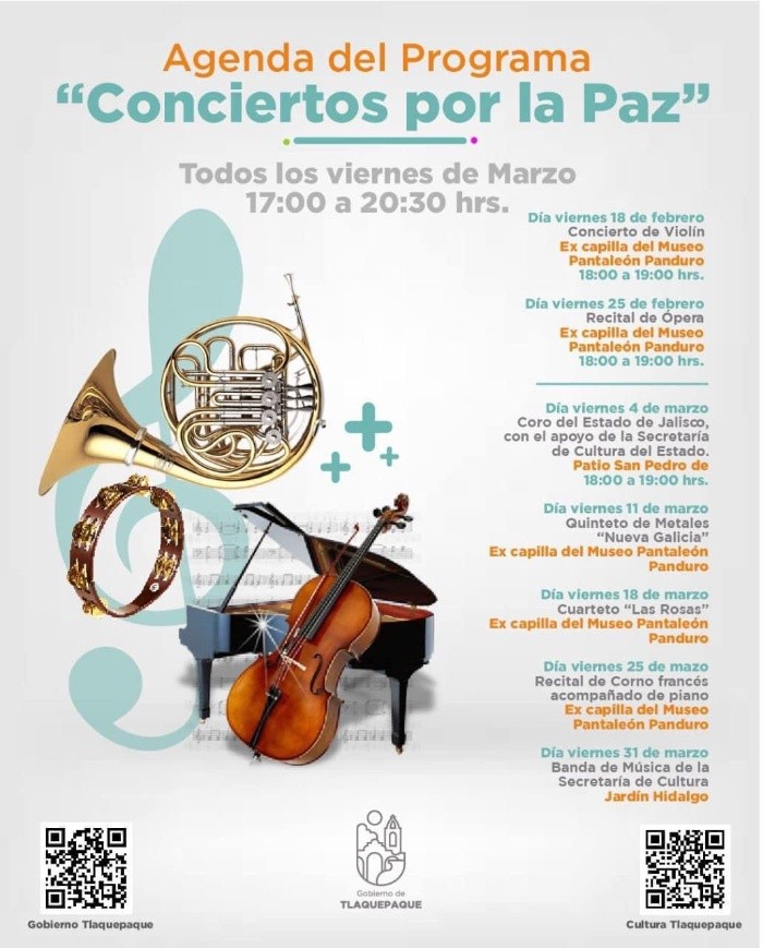 En el municipio de Tlaquepaque, todos los viernes del presente mes de marzo se está desarrollando el proyecto "Conciertos por la paz", el cual consiste en la presentación de shows con distintos exponentes donde se toca música formal. La cita es de 17:00 a 23:00 horas.Por ejemplo, este viernes 11 de marzo se presentará el quinteto de metales "Nueva Galicia" en la Ex capilla del Museo Pantaleón Panduro.El quinteto de maderas "Nueva Galicia" nace en la ciudad de Guadalajara en el año 2013 bajo el nombre Autunno Pilastri como una iniciativa de jóvenes estudiantes de música por extender el arte en todos los niveles sociales.Las primeras presentaciones fueron de manera local en parroquias y parques atrayendo la atención del público; en el año 2014 son invitados a la "Fete de la Musique", organizada por la Alianza Francesa de Guadalajara, y siendo programados con importantes artistas como Nury Ulate, principal de la filarmónica de Jalisco, México.Esa primera temporada pudieron presentarse en diversas actividades del Ayuntamiento de Guadalajara; conciertos didácticos en el Museo del Globo, o proyectos del Consejo Electoral y de Participación Ciudadana del estado de Jalisco.En el año 2016 buscaron reformar el ensamble y darle un carácter más profesional, en ese momento adquiere el nombre que lo representara hasta la actualidad: "Nueva Galicia". A partir de ese momento se buscó el asesoramiento de clases de música de cámara con el principal de oboe de la filarmónica de Jalisco, Jorge Rivero; lo que permitió la audición al concurso de música de cámara del Festival de música de Naolinco, Veracruz; y en el 2017 llegar de semifinalistas en el concurso de música de cámara de la Escuela Superior de Música.Ese mismo año comenzó una nueva etapa para el quinteto, profesionalizándose en la Escuela de Bellas Artes de la Universidad Panamericana de la Ciudad de México, recibiendo clases del principal de flauta de la Orquesta de Bellas Artes, Aníbal Robles; donde se lograron grandes avances camerísticos en obras como los quintetos de maderas del compositor checo Anton Reicha, el quinteto para piano y maderas de Rimsky Korsakov, y obras nacionales como la "Danza del mediodía" de Arturo Márquez, además de una estrecha colaboración con el afamado compositor mexicano Mario Lavista y sus cinco danzas breves para quinteto de maderas.Su regreso a Guadalajara en el año 2020, consolida la preparación del ensamble, listo para embarcarse de nuevo en la presentación de música tan rica y variada, como se ha mencionado anteriormente, en la Zona Metropolitana de Guadalajara, con la intención de fomentar espacios culturales en todos los rincones a los que les sea posible llegar.Flauta: Kevin Axel Mardueño Ramirez Oboe: Laura Jasmine Valdivia García Clarinete: Eduardo Cobián Medina Corno francés: Isidro Daniel González Cabezas Fagot: Jason Alejandro Rivera ÍñiguezJM