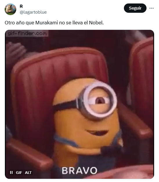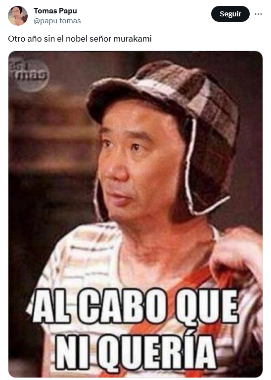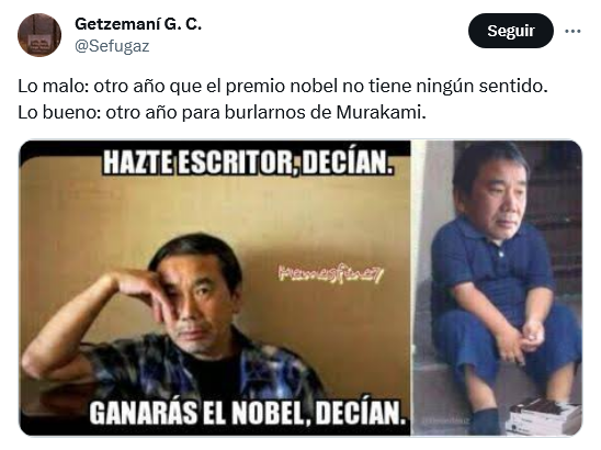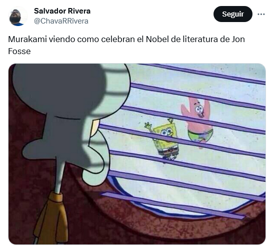 Hoy jueves 5 de octubre se dio a conocer al ganador del Premio Nobel de Literatura 2023. El sueco Jon Fosse resultó el galardonado de la edición de este año "por sus innovadoras obras de teatro y su prosa que dan voz a lo inefable", mientras que otra vez el consentido de muchos, el japonés Haruki Murakami, volvió a quedar descartado del anuncio de la Academia Sueca en Estocolmo.Jon Fosse, explica el comité del premio más prestigioso de las letras en el mundo, ha desarrollado un estilo que ha llegado a conocerse como el "minimalismo de Fosse", que se ve por ejemplo en su segunda novela, "Steng gitar" (1985), en la que hace variaciones sobre sus temas centrales, como el del momento crítico de la indecisión, dice El Universal.Donde Murakami sí triunfó, sin duda, fue en los memes que de inmediato comenzaron a circular en las redes sociales.OF