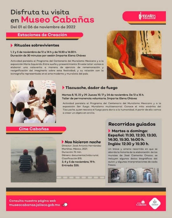 Como parte del Programa del Centenario del Muralismo Mexicano y la exposición "Ser fuego. Muralismo Multisensorial"; el Museo Cabañas ofrece una serie de actividades y talleres reflexivos que complementan la experiencia en tu visita al museo.Una de las que se estarán impartiendo este mes es "Tlacuache, dador de fuego" impartido por Elena Chávez, quien forma parte del equipo de Educación del Museo. "El taller toma como eje central el mito del tlacuache y el fuego, una narración de los pueblos originarios de México que se distingue por darle un origen al fuego dentro de la vida humana, ya la particular cola sin pelo de los tlacuaches, priorizando el tema del fuego como elemento transformador", compartió Elena.Durante la dinámica se verán involucrados tanto elementos de creación como lo son la arcilla y fomi moldeable, hasta elementos visuales y narrativos que permitan la reflexión de tal manera que se trate de una experiencia didáctica completa. Dale vida a tu propio tlacuache y resignifica el mito mientras se reflexiona sobre la propiedad transformadora del fuego, dando un nuevo significado positivo, es uno de los objetivos finales del taller.Esta actividad se llevará a cabo los días:En un horario abierto de 12:00 a 15:00 horas con permanencia voluntaria. El acceso a la actividad es gratuito con tu boleto de ingreso regular al museo.Con información de Museo Cabañas BB