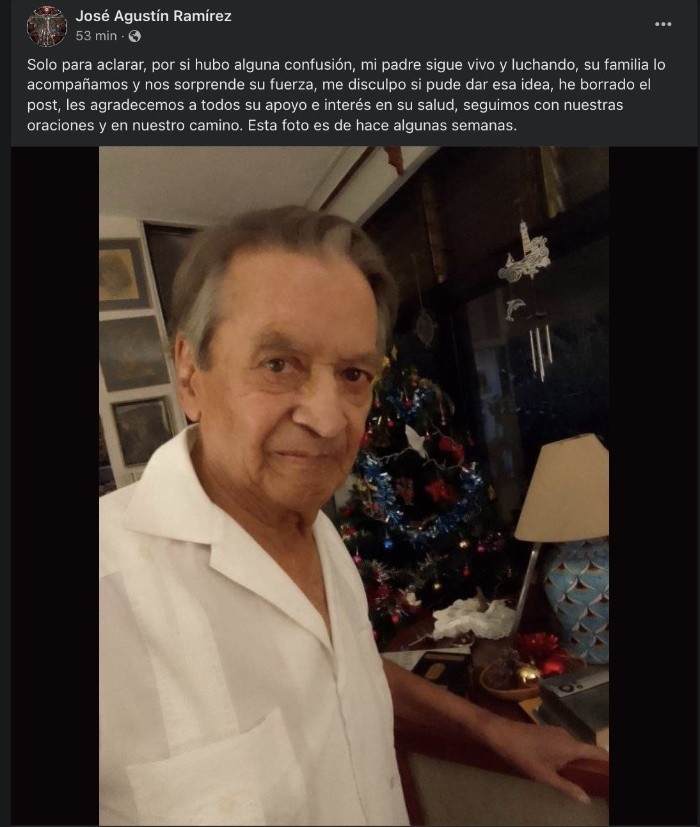 "Con esto ya mi trabajo aquí se va terminando", fueron las palabras del escritor José Agustín tras recibir la unción de los enfermos.Desde su cuenta de Facebook, José Agustín Ramírez, dibujante e hijo más joven del escritor, escribió: "La visita del padre José Luis, sacerdote católico/zapatista, viejo amigo de mi padre y fiel a la teología de la liberación, tras cuya unción de los enfermos, mi padre ha dicho: 'Con esto ya mi trabajo aquí se va terminando', quisiera agregar que gracias a todo el amor, solidaridad y oraciones de tod@s sus lectores, familia y amig@s, así como el cuidado de mi madre y hermanos, mi papá ha estado bastante mejor y más tranquilo, mil y un gracias a tod@s, si bien sigue en cama y la emergencia no termina, y sin duda José Agustín está un escalón más cerca del cielo, abrazos a tod@s, feliz 2024", escribióEl mensaje fue borrado al poco tiempo y en su lugar, se publicó una rectificación hecha por su hijo: "Sólo para aclarar, por si hubo alguna confusión, mi padre sigue vivo y luchando, su familia lo acompañamos y nos sorprende su fuerza, me disculpo si pude dar esa idea, he borrado el post, les agradecemos a todos su apoyo e interés en su salud, seguimos con nuestras oraciones y en nuestro camino. Esta foto es de hace algunas semanas".La unción sucedió después de que el autor de "Cerca del fuego" y "Se está haciendo tarde (final en laguna)" fuera reportado con pronóstico "reservado" el último fin de semana de 2023.Hace 11 años, en 2012, José Agustín sufrió un accidente durante una presentación en Puebla, en la que se rompió el cráneo y dos costillas; tras dicho incidente, el escritor guerrerense que le dio voz a una generación de la literatura mexicana, bautizada como La Onda por Margo Glantz, no volvió a publicar.En 2011, José Agustín ganó el Premio Nacional de Ciencias y Artes, y en 2005, el Mazatlán de Literatura.SV