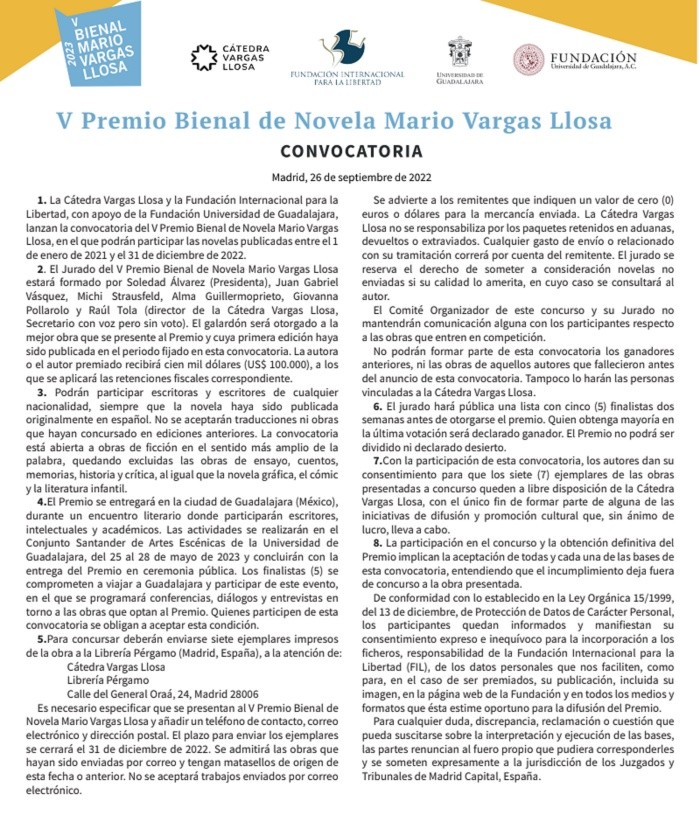 Con el apoyo de la Fundación Universidad de Guadalajara, la Cátedra Vargas Llosa y la Fundación Internacional para la Libertad convocan a las escritoras y los escritores de cualquier nacionalidad a participar en el V Premio Bienal de Novela Mario Vargas Llosa; un certamen en el que podrán participar las novelas publicadas originalmente en español, entre el 1 de enero de 2021 y el 31 de diciembre de 2022.El Premio, que estará dotado con cien mil dólares, se entregará durante la celebración de la Bienal Mario Vargas Llosa que se realizará del 25 al 28 de mayo de 2023, en el Conjunto Santander de Artes Escénicas de la Universidad de Guadalajara (UdeG).La convocatoria del Premio, que recibirá trabajos hasta el 31 de diciembre de 2022 está abierta a obras de ficción, y quedan excluidas las obras de ensayo, cuentos, memorias, historia y crítica, al igual que la novela gráfica, el cómic y la literatura infantil.Ahora bien, se admitirán las obras que hayan sido enviadas por correo y cuenten con el matasellos de origen de la fecha de cierre o anterior. No se aceptarán trabajos enviados por correo electrónico ni traducciones, así como tampoco obras participantes o ganadores de ediciones anteriores, o personas vinculadas a la Cátedra Vargas Llosa.El Jurado del V Premio Bienal de Novela Mario Vargas Llosa, que estará conformado por Soledad Álvarez (presidenta), Juan Gabriel Vásquez, Michi Strausfeld, Alma Guillermoprieto, Giovanna Pollarolo y Raúl Tola (director de la Cátedra Vargas Llosa), además de seleccionar la obra ganadora, elegirá a cinco finalistas dos semanas previas al fallo del Premio, quienes acudirán al encuentro literario en el Conjunto Santander de Artes Escénicas, para participar en conferencias, diálogos y entrevistas en torno a las obras que aspiran al galardón. El Premio no podrá ser dividido ni declarado desierto.Cualquier duda, discrepancia, reclamación o cuestión que pueda suscitarse sobre la interpretación y ejecución de las bases, las partes renuncian al fuero propio que pudiera corresponderles y se someten expresamente a la jurisdicción de los Juzgados y Tribunales de Madrid Capital, España.El Premio Bienal de Novela Mario Vargas Llosa lo han recibido Juan Bonilla, con ‘Prohibido entrar sin pantalones’ (2014); Carlos Franz, con ‘Si te vieras con mis ojos’ (2016); Rodrigo Blanco Calderón, con ‘The Night’ (2018), y Juan Gabriel Vásquez, con ‘Volver la vista atrás’ (2021).MF