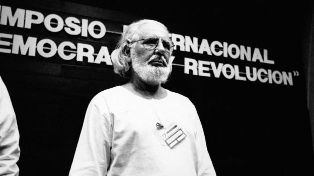La poesía ya había hecho de Ernesto Cardenal una figura de renombre internacional cuando una fotografía cimentó el estatus icónico del sacerdote nicaragüense, que falleció en Managua este domingo a los 95 años.En la imagen se lo ve con su inconfundible barba y cotona blancas, arrodillado ante el papa Juan Pablo II y esbozando una leve sonrisa, su eterna boina negra reposando humildemente en una de sus rodillas.El Papa, con gesto adusto y un dedo acusador, lo amonesta públicamente frente a sus colegas del gobierno de Nicaragua, congregados ese 4 de marzo de 1983 en el aeropuerto de Managua para recibir al pontífice."Usted debe regularizar su situación", fue el regaño público de Juan Pablo II durante su primera visita a tierras centroamericanas."Como no contesté nada, volvió a repetir la brusca admonición. Mientras, enfocaban todas las cámaras del mundo", contaría luego el poeta y sacerdote en su autobiografía. La escena fue la manifestación más pública del conflicto entre Cardenal y la jerarquía católica por causa de su compromiso con la revolución sandinista (1979-1990), durante la que se desempeñó como ministro de Cultura.Como uno de los más reconocidos exponentes de la teología de la liberación, el autor de El evangelio de Solentiname era una figura destacada de la feroz batalla entre el movimiento y Juan Pablo II, quien prohibió que los sacerdotes ejercieran puestos de gobierno.Pocos meses después, el papa polaco ordenaría la suspensión a divinis de Cardenal, lo que le impidió el ejercicio del sacerdocio por casi 35 años, hasta su revocación, en febrero de 2019, por el papa Francisco.La noticia de esa revocación le llegó mientras convalecía en un hospital de Managua, cada vez más alejado del partido sandinista y de su líder, Daniel Ortega, el hombre de gafas vestido de militar que aparece al lado de Juan Pablo II en la célebre fotografía.Cardenal recibió la noticia tal como había vivido: con la serenidad de haberse mantenido fiel a los valores que lo llevaron a renunciar a los privilegios que le garantizaba su cuna para abrazar el sacerdocio, la causa revolucionaria y la poesía."Mi poesía tiene un compromiso social y político, mejor dicho, revolucionario. He sido poeta, sacerdote y revolucionario", se definió en 2012, al ser reconocido con el Premio Iberoamericano de Poesía Reina Sofía.Nacido el 20 de enero de 1925 en Granada, en el seno de "una de las familias más respetables del país", el futuro sacerdote creció en una de las casonas más emblemáticas de la capital conservadora de Nicaragua."No era un palacio, pero sí el segundo edificio más elegante de Granada", es la descripción de "La Casa de los Leones" que hace en su autobiografía."El primero era la casa de mi abuelo, frente a la plaza central, junto a la catedral", apunta a continuación el poeta, quien describe a ese abuelo como un simple "comerciante rico".Para él la familia Cardenal Martínez había elegido la carrera de derecho.Pero su padre eventualmente se rindió a la evidente vocación literaria del enamoradizo muchacho y le permitió cursar estudios de literatura en México y EE.UU.Otra vocación igual o más fuerte, sin embargo, lo llevaría a ingresar en 1957 en el monasterio trapense de Gethsemani, en Kentucky (EE.UU.), espoleado por el final de uno de esos "muchos enamoramientos" que inspiraron sus famosos Epigramas."Yo no me iba a saciar con nadie, sólo con Dios -cosa que Dios sabía, pero yo no sabía", dice en el primer tomo de sus memorias, Vida perdida, sobre la tensión entre amor romántico y vocación religiosa que lo atormentó durante la primera parte de su vida.Poco después de llegar al monasterio les describió así la jornada a sus padres y hermanos: "¡No pueden imaginarse que viaje más feliz! Hagan de cuenta exactamente un viaje de bodas".En Gethsemani, el poeta nicaragüense conocería además a la mayor influencia política y religiosa de su vida."Tendrá de maestro de novicios a uno que también es poeta, en cierto sentido, y estudió como usted en la Universidad de Columbia", le habían anticipado ya en su carta de admisión, sin nombrar directamente al escritor y místico estadounidense Thomas Merton."Yo había leído prácticamente todos sus libros, e incluso traducido", cuenta de él Cardenal, para luego destacar que Merton solo había sido nombrado maestro de novicios aproximadamente un año antes de su llegada."Y eso lo atribuí a una acción especial de Dios para mí", dice del hombre que lo colocó sobre la ruta de un cristianismo comprometido políticamente y también inspiró la fundación, varios años más tarde, de la Comunidad de Nuestra Señora de Solentiname, en el archipiélago nicaragüense del mismo nombre.El paso de Cardenal por la Orden de la Trapa también lo ayudó a desarrollar su inconfundible estilo literario, que para entonces ya incluía el poema épico Hora 0, que no dejaba dudas de su aversión a las dictaduras de derecha latinoamericanas y en especial a la de su Nicaragua natal, la de los Somoza."Aunque no esté escribiendo poesía, el trabajo manual, que incluye limpiar inodoros, es una práctica de estilo, porque la humildad y sencillez de estos trabajos seguramente perfeccionará mi estilo literario, dándome más sencillez, claridad, expresión directa", escribió.Ese estilo sería también la marca de la comunidad de artistas primitivistas de Solentiname, fundada por Cardenal en 1966, un año después de su ordenamiento como sacerdote, que se convirtió rápidamente en un santuario para los guerrilleros del Frente Sandinista que luchaban contra la dinastía somocista."Al principio le había dicho a los líderes guerrilleros que estaba de acuerdo con sus metas pero no con sus métodos, pero ante la dictadura de Somoza, la única vía posible era la lucha armada", le dijo Cardenal a BBC Mundo en 2007.Luego del triunfo de la revolución en julio de 1979, Cardenal trató de replicar lo hecho en Solenti