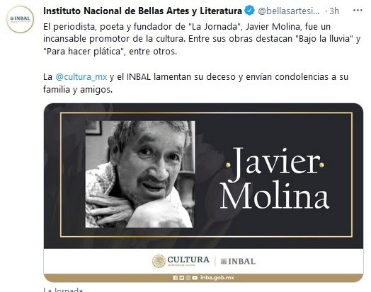 La Secretaría de Cultura del Gobierno de México y el Instituto Nacional de Bellas Artes y Literatura (INBAL) lamentaron el deceso, este domingo, del poeta y periodista Javier Molina, quien escribió obras como "Bajo la lluvia" (1974), "Para hacer plática" (1978), "Muestrario" (1984) y "La luz se rebela" (2003).El escritor originario de San Cristóbal de las Casas (1942) estudió sociología en la Facultad de Ciencias Políticas y Sociales de la Universidad Nacional Autónoma de México (UNAM), y trabajó como reportero cultural en los diarios "Unomásuno" y "La Jornada".En un comunicado, el INBAL señala que Molina era reconocido y estimado por los pobladores de San Cristóbal de las Casas, Chiapas, donde desde hace más de 15 años daba talleres de literatura como parte de los programas del Consejo Estatal para la Cultura y las Artes, y fue esa institución la que en 2011 le otorgó un reconocimiento por su trayectoria.Era considerado un ícono por las nuevas generaciones de poetas y escritores de su estado natal, y además fue colaborador en las revistas "Cultura Sur" y "Punto de Partida".jb