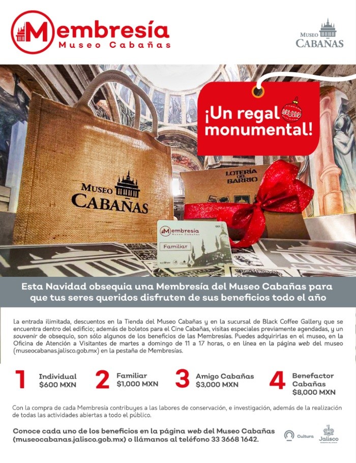 Por medio de un comunicado, el Museo Cabañas realiza una invitación para obsequiar membresías en esta temporada navideña; así su Programa de Membresías ofrece paquetes anuales con beneficios especiales; con su compra contribuyen a las labores de conservación e investigación del recinto, además de obtener diferentes beneficios y la oportunidad de ofrecer a sus seres queridos un regalo navideño diferente.El Programa de Membresías del Museo Cabañas también busca fomentar un espíritu comunitario, que los visitantes se apropien de este espacio emblemático de la ciudad, puedan participar de todas las actividades con beneficios especiales y, de igual manera, contribuyan en el crecimiento de su museo.Cada tipo de Membresía incluye una serie de beneficios diferentes de manera anual y es posible adquirirlas directamente en el museo, en la oficina de Atención a Visitantes, o en línea en la página web del museo (https://museocabanas.jalisco.gob.mx/). Los tipos de Membresía son:Con valor de 600 pesos/ Otorga credencial personalizada intransferible y entrada directa, gratuita e ilimitada al museo durante un año/ Un 5 por ciento de descuento en cursos y talleres, lo mismo para la Tienda del Museo Cabañas y en compras en Black Coffee Gallery del museo/ habrá 2x1 en boletos para funciones del Cine Cabañas/ Newsletter de miembro y souvenir de bienvenida.Vale mil pesos y brinda credencial personalizada intransferible, entrada directa, gratuita e ilimitada al museo para el miembro y tres acompañantes más, durante un año/ Visita guiada anual por Capilla Mayor (previa cita)/ 10 por ciento de descuento en cursos y talleres; lo mismo que en la Tienda del Museo Cabañas y en compras en Black Coffee Gallery del museo/ 3x1 en boletos para funciones del Cine Cabañas/ Newsletter de miembro y souvenir de bienvenida.Cuesta 3 mil pesos y otorga credencial personalizada intransferible, entrada directa, gratuita e ilimitada al museo para el miembro y cinco acompañantes más, durante un año/ Visita guiada anual a Capilla Mayor (previa cita)/ 15 por ciento de descuento en cursos y talleres; la Tienda del Museo Cabañas y en compras en Black Coffee Gallery del recinto/ 4x1 en boletos para funciones del Cine Cabañas/ Invitación a preinauguraciones con tres acompañantes/ Invitación a ruedas de prensa y recorrido comentado con el artista por la exposición/ Una visita guiada al año, con un acompañante, a la bodega de obra (previa cita)/ Newsletter de miembro y souvenir de bienvenida.Vale 8 mil pesos y ofrece credencial personalizada intransferible, entrada directa, gratuita e ilimitada al museo para el miembro y siete acompañantes más, durante un año/ Visita guiada a Capilla Mayor (previa cita)/ 20 por ciento de descuento en cursos y talleres; la Tienda del Museo Cabañas y en compras en Black Coffee Gallery del museo/ 6x1 en boletos para funciones del Cine Cabañas/ Invitación a preinauguraciones con cinco acompañantes/ Visita guiada por las exposiciones vigentes (previa cita)/ Invitación a ruedas de prensa y recorrido comentado con el artista por la exposición (previa cita)/ Visita nocturna guiada anual a la Capilla Mayor (previa cita)/ Visita privada anual a la bodega de obra con un acompañante (previa cita)/ Permiso para una sesión fotográfica anual en uno de los patios (previa cita)/ Dos lugares en las funciones de cine al aire libre con previa reservación/ Newsletter de miembro y souvenir de bienvenida.Para adquirirlas se debe ingresar a la página web del museo y seleccionar la que mejor se adapte a sus necesidades; es posible hacer el pago en línea en la pestaña de Membresías, donde se abrirá un formulario para que se completen los datos y el miembro reciba su paquete personalizado. Les llegará un comprobante de pago a su correo electrónico y el museo les contactará para solicitarles una fotografía para su credencial y agendar la entrega de su kit.Si prefieren pagar directamente en el museo, es posible hacerlo en la oficina de Atención a Visitantes, en efectivo o con tarjetas de crédito o débito, de martes a domingo de 11:00 a 17:00 horas. Se les tomará una fotografía para su credencial y sus datos para hacerles llegar su kit a casa. Asimismo, se pueden solicitar factura deducible de impuestos a través de la dirección de correo electrónico (admon.museocabanas@gmail.com). El Programa de Membresías del Museo Cabañas estará abierto de manera permanente.También se puede mantener contacto con el museo y enterarse de las actividades de su programa a través de redes en Facebook, Instagram, Twitter (@museocabanas), YouTube, Spotify, Telegram o la tradicional página web: museocabanas.jalisco.gob.mx.FS