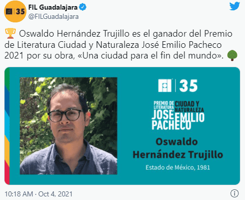 Por su obra "Una ciudad para el fin del mundo", firmada con el seudónimo LEMARC, el narrador mexicano Oswaldo Hernández Trujillo obtuvo el sexto Premio de Literatura Ciudad y Naturaleza José Emilio Pacheco porque hace una reflexión contemporánea y muy pertinente sobre la ciudad y el papel de la naturaleza en él, indica el acta.El jurado integrado por Cecilia Eudave, Antonio Ortuño y Bernardo Esquinca determinó concederle el premio de manera unánime al también traductor, editor y profesor universitario por "la calidad narrativa de su prosa, que resulta en un volumen bien conjuntado" así como por "la singularidad de su visión en la que el entorno natural acompaña las acciones y las emociones de los personajes"."Una ciudad para el fin del mundo" fue seleccionada entre 101 trabajos de Alemania, Argentina, Chile, Colombia, Costa Rica, Cuba, Ecuador, España, Estados Unidos, Guatemala, México y Perú. La ceremonia de premiación se realizará el sábado 4 de diciembre próximo en el salón México del hotel Hilton, durante la celebración de la edición 35° de la Feria Internacional del Libro de Guadalajara, que se realizará del 27 de noviembre al 5 de diciembre en Expo Guadalajara, así como por Facebook, YouTube y la página de la Feria.Oswaldo Hernández Trujillo es traductor, editor y profesor universitario. Nació en 1981 y creció en el Estado de México. Estudió letras clásicas en la Universidad Nacional Autónoma de México (UNAM), donde también cursó la maestría en lingüística aplicada. Trabajó en el "Diccionario del Español de México" de El Colegio de México, y como editor en el Museo Nacional de Arte y el Museo del Palacio de Bellas Artes. Ha escrito poesía, crónica y crítica para revistas como "Tierra Adentro", "Kilómetro Cero" y el "Periódico de Poesía" de la UNAM.Es autor del volumen de cuentos "Ustedes no existen", con el que obtuvo el Premio de Literatura Laura Méndez de Cuenca (2019).El premio está dotado con diez mil dólares estadounidenses y la publicación del libro ganador, el Premio de Literatura Ciudad y Naturaleza José Emilio Pacheco, que nació en memoria del escritor mexicano como un espacio para incentivar la creación literaria y la apreciación estética de la naturaleza, es convocado por la Universidad de Guadalajara, mediante el Museo de Ciencias Ambientales del Centro Cultural Universitario, en colaboración con la FIL Guadalajara.Sigue leyendo…Si te interesó esta noticia y quieres saber más, entonces descarga y descubre INFORMAPlus, la aplicación digital de EL INFORMADOR, en donde tenemos contenidos exclusivos, seleccionados por nuestros editores, para darles una experiencia más completa a los lectores.Descarga la aplicación y pruébala GRATIS por treinta días.Si eres suscriptor de EL INFORMADOR tu acceso está incluido, solicítalo al 33 3678-7777AF