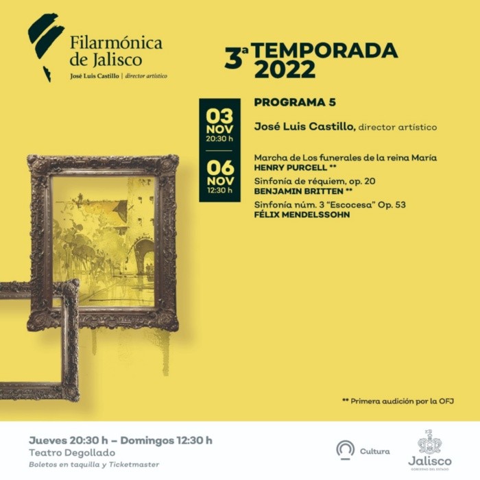 La Orquesta Filarmónica de Jalisco (OFJ) prepara, para su programa de este jueves 3 de noviembre a las 20:30 horas y domingo 6 de noviembre a las 12:30 horas, lo que ha dado en llamar “una excursión sinfónica al Reino Unido” en la que se contemplan piezas de compositores como Benjamin Britten y Felix Mendelssohn; la cita para ambos conciertos tendrá como sede el Teatro Degollado.Así, la orquesta será dirigida por el maestro José Luis Castillo para interpretar, en primer término, la ‘Marcha de los funerales de la Reina María’ de Henry Purcell, al redoble del tambor y el brillo de los metales, del siglo XVII; para luego llegar al siglo XX con la ‘Sinfonía de Réquiem’, compuesta por Benjamin Britten en 1940, la obra de más grande escala que este compositor haya escrito para interpretarse en las salas de concierto.Amante de las Islas Británicas, el compositor alemán Felix Mendelssohn se inspiró en su visita a Escocia durante 1829 para componer dos importantes obras: la ‘Obertura de la Cueva de Fingal’ y la ‘Sinfonía núm. 3 “Escocesa”’; por lo que, esta aventura sinfónica, llevará a los oyentes a esa región del Reino Unido, para cerrar de ese modo este concierto con la ejecución de los cuatro movimientos de dicha sinfonía.Para este concierto, los boletos están ya a la venta a través del sistema Ticketmaster y en las taquillas del Teatro Degollado, con un costo que va de los 110 a los 250 pesos, y con descuentos de 30 por ciento para estudiantes, maestros, personas con discapacidad y de la tercera edad.Finalmente, esta tercera Temporada 2022 de la OFJ concluye el próximo 11 de diciembre en el Teatro Degollado. Más detalles se pueden encontrar en el sitio: www.ofj.com.mx, al igual que en redes sociales de la agrupación, en Facebook (Orquesta Filarmónica de Jalisco), Twitter (@OFilarmonicaJal) e Instagram (@filarmonicadejalisco).MF