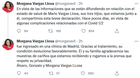 El premio Nobel de Literatura Mario Vargas Llosa, de 86 años, se encuentra ingresado en una clínica de Madrid a causa de "algunas complicaciones relacionadas" con el COVID-19, pero "evoluciona favorablemente".En un breve comunicado publicado en Twitter, sus hijos Álvaro, Gonzalo y Morgana aseguraron este viernes que están junto a su padre y que, gracias al tratamiento, se encuentra mejor."Él y su familia agradecemos las muestras de cariño que estamos recibiendo y rogamos a la prensa que respete su privacidad", concluye el mensaje.El ingreso del escritor hispano-peruano se produjo "hace unos días" tras complicarse su situación debido al COVID-19, que ya le había obligado a permanecer aislado en su casa de Madrid.Por ese motivo, la Real Academia Española (RAE) aplazó el acto previsto para el martes pasado, en el que Mario Vargas Llosa iba a conversar con el director de la entidad, Santiago Muñoz Machado, sobre su libro "Cervantes" y que iba a marcar el inicio de la Semana Cervantina, con motivo de la entrega del Premio Cervantes.El acto, que se había aplazado en un primer momento hasta el próximo lunes, se celebrará finalmente el 25 de mayo, según confirmaron fuentes de la RAE.Vargas Llosa (Arequipa, Perú, 1936) tiene, además del Nobel concedido en 2010, otros reconocimientos como el Cervantes en 1994 y el Príncipe de Asturias de las Letras en 1986, y es autor de obras como "La ciudad y los perros" (1963) y "La fiesta del Chivo" (2000).OA