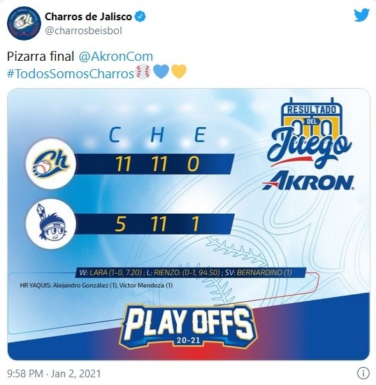 Dentro de playoffs no se puede regalar nada, y eso lo saben a la perfección los maderos de Charros de Jalisco, pues con un rally de ocho carreras en la primera entrada del encuentro, los caporales se agenciaron el primer juego de postemporada ante los Yaquis de Ciudad Obregón, esto con pizarra final de 11-5.Dentro del Nuevo Estadio Yaquis (NEY) el abridor André Rienzo tuvo una apertura para el olvido, pues en apenas dos tercios de entrada los maderos jaliscienses le conectaron tres imparables, siete carreras y regaló dos bases por bola sin que pudiera cuando menos abanicar a un rival.Esta pésima labor de Rienzo fue lo que marcó el rumbo del encuentro, y aunque Faustino Carrera lo relevó para evitar un mayor castigo por parte del rival, antes de que consiguiera el tercer out de ese rollo los Charros timbraron por octava ocasión.Para fortuna de la tribu, después de esa primera entrada para el olvido pudieron contener a la ofensiva de Charros, pues entre el segundo y el séptimo rollo los de Jalisco no volvieron a llegar a la registradora.Lo anterior permitió que Yaquis se acercara en la pizarra hasta el punto de quedarse a sólo tres carreras del empate momentáneo, sin embargo para el octavo episodio los caporales consiguieron otra rayita en los spikes de Agustín Murillo, quien llegó al plato después de que Carlos Figueroa conectara un roletazo al jardín central.Para cerrar la cuenta en la novena, por Jalisco timbraron Esteban “Pony” Quiroz y Oziel Flores. En contraparte, Brennan Bernardino se agenció el salvamento al cerrar el juego y sacar los últimos cuatro outs del compromiso.Ahora, este domingo Charros tratará de repetir la dosis en el NEY, pues en punto de las 18:00 horas (tiempo del centro del país), los caporales volverán a medirse a Yaquis en el segundo compromiso de esta primera serie de playoffs de la Temporada 2020-2021 de la Liga Mexicana del Pacífico.Para este segundo compromiso, el encargado de abrir el juego para los Charros será el ocotlense Luis Iván Rodríguez.JM