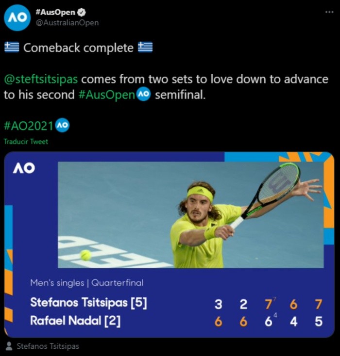 El español Rafael Nadal, número dos mundial, quedó eliminado en cuartos de final del Abierto de Australia al perder en un emocionante duelo ante el griego Stefanos Tsitsipas, sexto del ranking ATP y que se impuso 3-6, 2-6, 7-6 (7/4), 6-4 y 7-5, este miércoles en Melbourne.Nadal dejó así escapar una ventaja de dos sets a cero y Tsitsipas disputará el viernes su segunda semifinal del Abierto de Australia y la tercera en un Grand Slam, contra el ruso Daniil Medvedev (cuarto del mundo), que ganó horas antes a su compatriota Andrey Rublev (octavo) por 7-5, 6-3 y 6-2.Tsitsipas no podía ocultar su emoción por la gran victoria al término del partido."No tengo palabras... He recuperado mi tenis. Es un sentimiento increíble poder luchar a este nivel y poder darlo todo en la pista", afirmó."Estaba nervioso al principio. No sé qué pasó después del tercer set, volaba como un pajarito, todo me funcionaba. Es algo indescriptible", añadió.Tsitsipas es el tercer jugar que consigue remontar dos sets en contra en un partido contra Nadal, después del suizo Roger Federer en la final de Miami en 2005 y del italiano Fabio Fognini en la tercera ronda del Abierto de Estados Unidos de 2015.Nadal, campeón en octubre de su decimotercer título en Roland Garros y con él de su vigésimo en un Grand Slam (un récord, igualado con Roger Federer), tendrá que seguir esperando para ganar el 21 y fijar una nueva plusmarca en el circuito masculino.OF