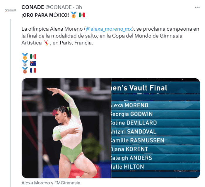 Alexa Moreno puso en alto en nombre de México en el Campeonato del Mundo de Gimnasia FIG que se está llevando a cabo en París, Francia, al ganar la medalla de oro en la prueba de salto de caballo.Moreno sigue luciendo y cosechando triunfos, en la modalidad quedó en primer lugar con un puntaje de 14.075, dejando atrás a la australiana Georgia Godwin que terminó en 13.850 y la francesa Coline Devillard con 13.800.Además de la presea dorada, más tarde la olímpica se adjudicó la medalla de bronce en la final de ejercicio de piso con 13.300.En esta prueba, el oro se lo llevó la anfitriona Melanie de Jesus dos Santos con 13.650; mientras que, la segunda posición fue para la brasileña Jade Barbosa que terminó en 13.400.Con su carisma y gran talento, la nacida en Mexicali hizo una gran actuación que fue merecedora de estas dos medallas.Alexa brilló en sus respectivas pruebas, pero aún seguirá buscando su lugar en los Juegos Olímpicos del próximo año.La siguiente competición de Moreno será el Campeonato Mundial de Gimnasia Artística que se realizará en Bélgica, donde buscará la plaza a los Juegos Olímpicos de París 2024OA