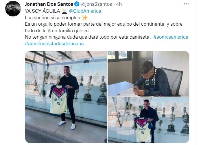 El tan anhelado fichaje de Jonathan dos Santos se convirtió en una realidad. Nada más pisar el Nido, el centrocampista mexicano confesó que para él vestir la playera del Club América, siempre había sido su sueño y el de su padre, Zizinho. “Estoy muy feliz de poder cumplir un sueño, muchos niños quieren jugar siempre en el equipo de sus sueños, estoy aquí con lo mismo, cumpliendo mi sueño, se hace realidad por fin después de mucho tiempo queriendo estar aquí y ahora a disfrutar el momento", expresó. Además, Jonathan dos Santos recordó a su padre, quien también vistió la playera de las Águilas y el cual falleció durante este 2021. “Mi papá siempre nos decía, ustedes tienen que jugar en el América, tienen que cumplir ese sueño, es el mejor equipo de México. Es un honor, es un placer también poder cumplir el sueño de la familia, no solo mío sino de mi papá, yo creo que él estuvo trabajando en el cielo para que esto se hiciera realidad", agregó. Finalmente, Jonathan se mostró comprometido con el conjunto azulcrema y descartó que venga en plan de retiro, pues aseguró que aún tiene mucho por ofrecer en el campo. “Vengo en la plenitud, tengo 31 años, la gente dice que me vengo a retirar, para nada, tengo todavía muchísimo por dar a mí mismo y al club. Tengo hambre, muchísima hambre de poder conseguir títulos con el América, hacer feliz a la afición, es lo más importante, disfrutar, disfrutar el momento y lo que estoy viviendo". JL