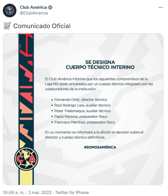 ¿Quién será el técnico del América? Ayer, la directiva de las Águilas informó que había terminado el ciclo del argentino Santiago Solari debido a la crisis que atraviesa el equipo en el Torneo Clausura 2022, y esta mañana ya se dio a conocer quién estará al frente del equipo este fin de semana.América visitará a Rayados de Monterrey el próximo sábado a las 19:00 horas, y lo hará bajo el mando de Fernando Ortíz, quien tomará el cargo de director técnico de manera interina. Fernando Ortíz es el técnico del conjunto Sub-20 del América. Para el partido ante Monterrey estarán con él Raúl Lara (auxiliar de DT), Peter Thelemaque (auxiliar), Paolo Pacione (prepador físico), y Francisco Martínez (prepador físico).El técnico de fuerzas básicas estará en el puesto solo de manera interina, dijo el América en un comunicado que difundió en sus redes sociales, en el que también resaltó que la información sobre el próximo estratega definitivo, será anunciado en cuanto se tengan noticias.América, de momento, está en el último lugar de la Tabla General del Clausura 2022 con solo seis puntos, por lo que es apremiante regresar al camino del triunfo.OF