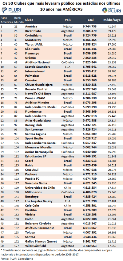 El América sería el equipo que más aficionados ha llevado a los estadios en el continente americano en los últimos diez años, según un estudio elaborado por la empresa brasileña Pluri consultoría.Las Águilas encabezan la lista con una asistencia total acumulada de nueve millones 744 mil 753 aficionados, un promedio de 41 mil 644 seguidores por partido.Los primeros diez lugares de la lista los completan el River Plate (Argentina), Corinthians (Brasil), Monterrey (México), Tigres de la UANL (México), Sao Paulo (Brasil), Flamengo (Brasil), Gremio (Brasil), Atlético Nacional (Colombia) y los Seattle Sounders (Estados Unidos).Chivas aparece en décimo cuarto lugar, como cuarto equipo mexicano de la lista y Atlas en la posición 22, el sexto entre los mexicanos, por debajo de los Pumas.Los otros mexicanos que integran la lista son Santos (puesto 25), Monarcas Morelia (28), Cruz Azul (33), Pachuca (34), Puebla (35), Toluca (47), Querétaro (49).El estudio considera solamente los partidos oficiales de los campeonatos nacionales e internacionales disputados entre 2008 y 2017. RR