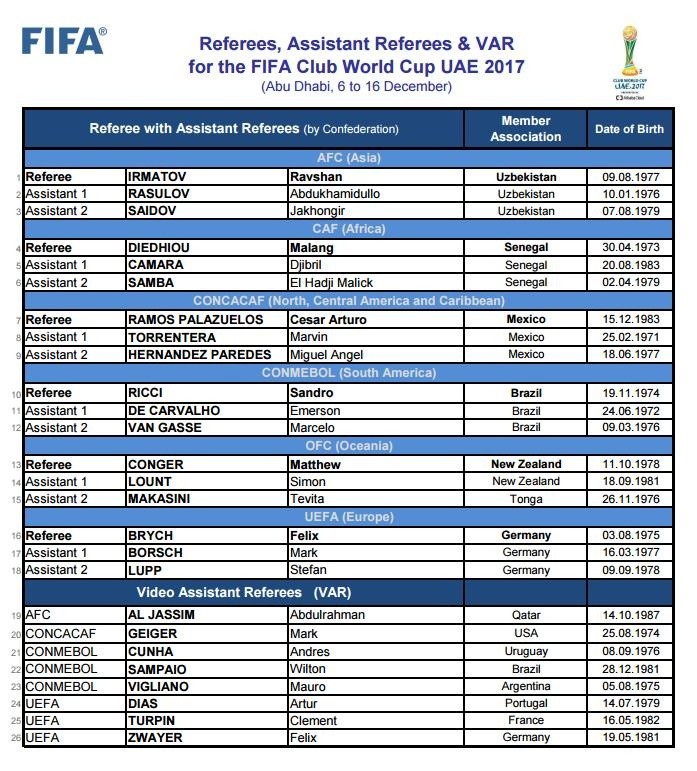 Este martes, la FIFA dio a conocer la lista de los colegiados que pitarán en la próxima edición de la Copa Mundial de Clubes de la FIFA Emiratos Árabes Unidos 2017. Entre ellos, destaca el trío arbitral de la Concacaf, compuesto por los mexicanos César Arturo Ramos, Marvin Torrentera y Miguel Ángel Hernández Paredes.Se trata de seis tripletas arbitrales las que tendrán actividad en la competencia, una por cada una de las confederaciones del futbol mundial, quienes dirigirán los ocho partidos. También se asignó a ocho nazarenos más para llevar a cabo acciones como asistentes de video (VAR) durante el torneo que se jugará el mes próximo.Según el comunicado publicado por la Federación, los árbitros deberán arribar a la sede, Abu Dhabi, el próximo 30 de noviembre, para prepararse antes del partido inaugural.La Copa Mundial de Clubes se disputará del 6 al 16 de diciembre, y la final será en el Estadio Internacional Zayed Sports City de Abu Dhabi.