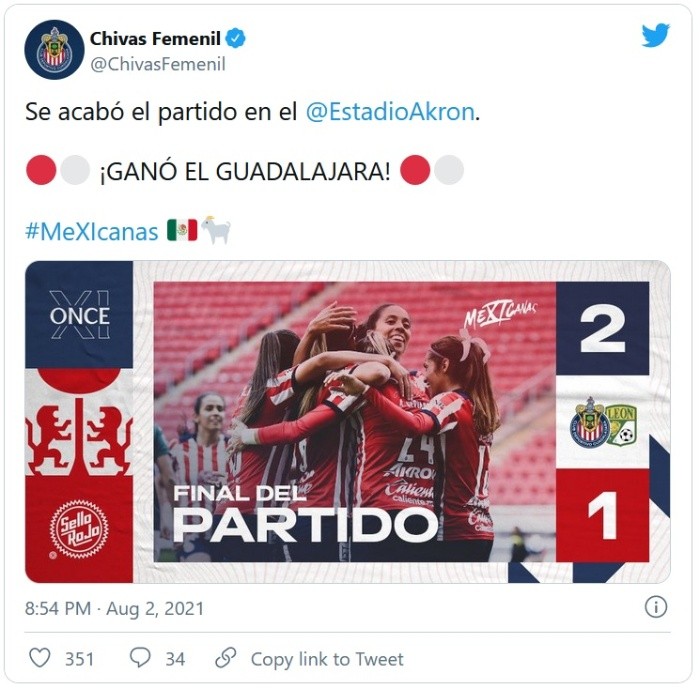 Con goles de Alicia Cervantes y Joseline Montoya, Chivas Femenil derrotó a su similar de León 2-1 en el Estadio Akron, dentro de la Jornada 3 de la Liga MX de dicha categoría, por lo que las rojiblancas siguen al acecho de la cima, además de mantener el invicto en este Apertura 2021. El gol de las Esmeraldas fue obra de Sandra Camacho al 88’.Con su gol al minuto 35, el cual fue asistencia de Carolina Jaramillo, “Licha” Cervantes llega a 35 goles con las rojiblancas, siendo ya una histórica del club que hoy le da la oportunidad. Mientras que Joseline Montoya sigue demostrando que vive un gran momento al anotar al 85’, aprovechando una falla de la defensa leonesa.Gracias a este resultado, Chivas Femenil llega a siete puntos y está en la parte alta de la tabla general y la próxima semana se medirá a Juárez FC Femenil el próximo lunes 9 de agosto en la ciudad fronteriza.Si te interesó esta noticia y quieres saber más, entonces descarga y descubre INFORMAPlus, la aplicación digital de EL INFORMADOR, en donde tenemos contenidos exclusivos, seleccionados por nuestros editores, para darles una experiencia más completa a los lectores. Si eres suscriptor de EL INFORMADOR tu acceso está incluido, solicítalo al 33 3678-7777Descarga la aplicación y pruébala GRATIS por treinta días.Para iOS: https://apple.co/35jaVgbPara Android: https://bit.ly/3gwVSEVJM