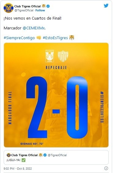El francés André-Pierre Gignac anotó este sábado un doblete para que los Tigres UANL vencieran por 2-0 al Necaxa y se clasificaran a la Liguilla del Apertura 2022, en los que se enfrentará al subcampeón Pachuca.Con sus dos goles en la repesca, Gignac llegó a 28 en las fases finales de la Liga MX para empatar en el tercer lugar de los máximos anotadores con Alberto García Aspe; el primer lugar lo ocupa el exfutbolista paraguayo José Saturdino Cardozo, con 43 dianas.Los Tigres dominaron el primer tiempo, a pesar de que a los 20 minutos sufrieron la expulsión de Javier Aquino, quien hizo una plancha al uruguayo Facundo Batista.Aunque fueron los dominadores del duelo, los felinos sólo lograron realizar un tiro peligroso, cuando en el minuto 34 el argentino Guido Pizarro remató a puerta, disparo rechazado por el guardameta Luis Malagón.Mientras que el Necaxa fue incapaz de concretar un disparo a portería ya que apostó por el contragolpe, incluso tras la tarjeta roja que se ganó Aquino.El Necaxa se condenó a la eliminación al sufrir en el minuto 50 la expulsión de Batista, quien pisó por detrás a Raymundo Fulgencio.De nuevo con el mismo número de jugadores en la cancha, los Tigres se adelantaron en el marcador. En el 60, Gignac cobró un tiro libre que entró por el ángulo superior derecho de Malagón para el 1-0.Tras un fallo del brasileño Samir De Souza, los felinos aumentaron su ventaja. Fulgencio, desde la derecha, cruzó un centro al área que Gignac, con la frente, convirtió en el 2-0 en el 73.JM