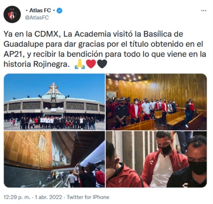 En un acto de agradecimiento y fe, el plantel de los rojinegros del Atlas acudió este viernes a la Basílica de la Virgen de Guadalupe en la Ciudad de México con la finalidad de agradecer por el título obtenido en diciembre pasado frente a León en el Estadio Jalisco.El campeón se encuentra en la CDMX para encarar su partido de la jornada 12 del Torneo Clausura 2022, el cual será frente a Cruz Azul este sábado por la tarde en el Estadio Azteca, y como parada técnica, los dirigidos por Diego Martín Cocca no podían desaprovechar la oportunidad de agradecer y pedir por los proyectos futuros, salud, bienestar para ellos y sus familias, buenos resultados y luchar por un título más.OF