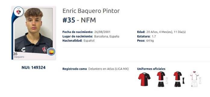 En los registros mostrados por la Liga MX en su sitio oficial, en el apartado de los rojinegros del Atlas aparece el español Enric Baquero, futbolista de 20 años y que se desempeña como delantero y que ha tenido actividad ya con los Zorros desde el torneo pasado con el equipo Sub-20.El ibérico, que portará el número "35", buscará un puesto en el equipo para el Clausura 2022 y cuando ya vistió la playera de los Zorros disputó cinco partidos y 325 minutos, en donde no se pudo hacer presente en el marcador.Ahora, para el Clausura 2022, el español buscará ganarse un puesto en el equipo de Diego Martín Cocca, en donde jugará bajo la sombra del "Emperador" Julio Furch y de Julián Quiñones, hasta hoy titulares indiscutibles del equipo campeón.OF