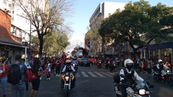 Antes de comenzar con la fiesta con sus aficionados y el desfile por las calles del centro de la capital tapatía, el plantel del campeón Atlas acudió a la Catedral de Guadalajara para asistir a misa, con el trofeo en manos del capitán.Aldo Rocha encabezó al grupo de Rojinegros que llegó en el autobús del equipo a la ceremonia eucarística, a la que también acudieron el alcalde tapatío, Pablo Lemus; el presidente deportivo de los Zorros, José Riestra; además de Alejandro Irarragorri, como cabeza principal del Grupo Orlegi.Durante la misa, los jugadores y directivos agradecieron por el semestre exitoso que logró el equipo, mostrando el trofeo como testigo de la meta alcanzada.En el exterior más de mil 500 aficionados de los Zorros esperaban a sus héroes para vitorearlos y arroparlos con cantos al salir.A las 15:24 horas los Rojinegros salieron de la Catedral, y afuera ya les esperaba un autobús descubierto en el que subieron todos hasta el segundo nivel, con familiares e integrantes del cuerpo técnico.Rocha, Julio Furch e Irarragorri se colocaron en la parte frontal, mostrando el trofeo de campeones.A las 15:40 comenzó el recorrido que tendría escala en el Parque Rojo, para culminar en la Glorieta de los Niños Héroes, en donde serían esperados por miles de seguidores que desean seguir con la celebración.