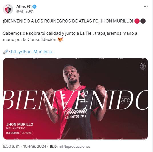 El Atlas ha oficializado la llegada del delantero venezolano Jhon Murillo al Primer Equipo de los rojinegros. Murillo, quien previamente formaba parte del Atlético de San Luis, se une a los Rojinegros tras destacar en las semifinales del Apertura 2023 con su equipo anterior y así, el cuadro ya suma su segunda incorporación, luego de contar ya con Raymundo Fulgencio. El nuevo fichaje, bajo la dirección de Beñat San José, se incorporó rápidamente a las prácticas del equipo, que se prepara intensamente para su próxima participación en la Liga MX, en donde este domingo debutan como visitantes ante Necaxa.Iniciando su carrera profesional en Venezuela con el Zamora FC, Murillo logró notoriedad al contribuir a dos títulos locales y participar en varias ediciones de la Copa Libertadores.Su destacada actuación en competiciones continentales atrajo la atención de equipos europeos, siendo el Benfica de Portugal el primero en asegurar sus servicios en 2015. Jhon Murillo fue cedido al Club Deportivo Tondela para su desarrollo, antes de destacarse en la Primera División Turca con el Kasımpaşa Spor Kulübü durante la temporada 2017-2018.Además de sus logros a nivel de clubes, Murillo ha representado a Venezuela en diversas categorías, desde juveniles hasta la selección absoluta. Su participación en eliminatorias mundialistas y en tres ediciones de la Copa América lo ha consolidado como un elemento clave para la Vinotinto, que busca un lugar en el próximo mundial de la FIFA y se destaca como el equipo revelación en Conmebol. Con la incorporación de Jhon Murillo, Atlas fortalece su plantel con un jugador de experiencia internacional y habilidades destacadas y competirá por un lugar en el ataque con Jordy Caicedo, Eduardo Aguirre, Bryan Trejo, Raymundo Fulgencio, Mateo García y Augusto Solari.*Mantente al día con las noticias, únete a nuestro canal de WhatsAppOF