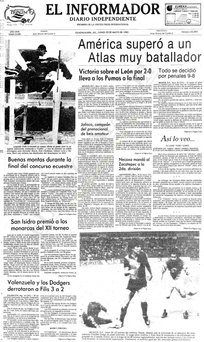 Este viernes se reanudan las acciones del futbol mexicano con la Jornada 4, y quizá el partido más importante sea el del próximo domingo 20 de agosto, cuando Atlas reciba al América en el Estadio Jalisco. A Guadalajara regresa Julián Quiñones, delantero que vivió las grandes glorias con Atlas apenas el año pasado, cuando el equipo se coronó bicampeón del balompié nacional, y, sin embargo, ahora intentará mostrar su espectacular manera de jugar, pero para la causa emplumada.Este reencuentro no es el único aspecto destacado del juego, pues los partidos entre Atlas y América han sido muy atractivos históricamente. Al menos así fue la serie de las semifinales de la temporada 1984-1985, cuando las Águilas dejaron fuera a los zorros en una emocionante tanda de penales."Nosotros no nos sentimos vencidos. Vamos a ir al Azteca a dar mucha guerra. Ojalá se confíe el América", dijo el técnico rojinegro Alfredo "Pistache" Torres, luego del empate obtenido en el Estadio Jalisco, y como atestigua EL INFORMADOR en la edición del 17 de mayo de 1985.Los equipos empataron 1-1 en la ida. El entrenador, sin embargo, mantenía la esperanza de que podían salir adelante ante unas Águilas que dominaban el campeonato."Para mí -aclaró el 'Pistache'-, el América es uno de los mejores equipos de México, muy bien plantado en la cancha. El Atlas sigue en la pelea a pesar de todo".La crónica de la ida relata: "Por el centro del campo, Masciarelli le ganó el balón a Luna y proyectó un lanzamiento en profundidad sobre Aceves, perfilado por la entretela izquerda. Entre Manzo y Tena cuidaron al capitán rojinegro; pero, ante la salida de Zelada sin aparente peligro, el balón rebotó en la cabeza de Tena hacia la boca del marco. Lo que aprovechó Aceves para disparar sobre el zaguán abierto, anotar el tanto y provocar el entusiasmo entre los fanáticos".Así llegaron a la vuelta, pero tras otros 90 minutos en los que terminaron iguales incluso en los tiempos extra, el finalista que se enfrentaría a Pumas se definió en los penales."El equipo de futbol América clasificó para la ronda final del Campeonato Mexicano de Primera División al vencer 9-8, en serie de penales, al Atlas en cotejo correspondiente a la ronda semifinal que se llevó a cabo en el Estadio Azteca", recoge EL INFORMADOR en su edición impresa del 20 de mayo."Diez tiros de pena máxima fueron ejecutados con maestría, lo que dejó los cartones empatados a cero goles, y 1-1 en el global. Vinieron después los tiros alternos y fue allí en donde el América amarró la victoria que lo enfrentará la próxima semana, en dos cotejos frente a Pumas de la Universidad Nacional Autónoma de México"."Alfredo Torres, técnico del Atlas, así como los integrantes del plantel, abrazaron a López Lomelí, dándole ánimos para que dejara de llorar, al ver que éste se sentía deshecho por haber echado su tiro sobre la cabaña enemiga".América se midió a Pumas, y en un tercer partido de desempate se impuso finalmente a su rival de la ciudad para coronarse campeón de la Liga por quinta vez en su historia.Atlas y América se enfrentarán este domingo 20 de agosto a las 19:10 horas tiempo del centro de México en el Estadio Jalisco.OF