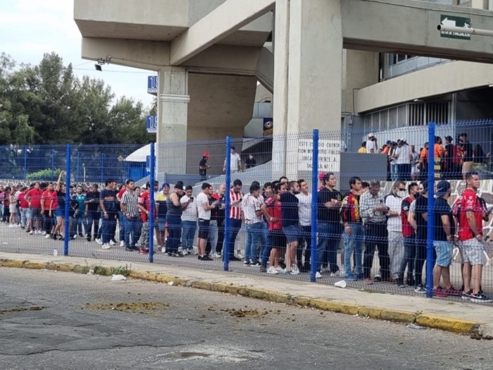 Mientras al interior del Estadio Jalisco ya se escucha toda la algarabía del Clásico Tapatío, miles de aficionados continúan formados para poder ingresar al coloso de la Calzada Independencia.A tan sólo minutos de haber comenzado la Vuelta de los Cuartos de Final entre Chivas y Atlas, todavía hay largas filas afuera del Estadio Jalisco.La fanaticada está desesperada por la lentitud con la que han operado el ingreso al inmueble y sobre todo ha manifestado su descontento con la medida del Fan ID."Esto ya es una locura. Mi familia y yo llevamos una hora formados y lo que falta. Deben operar esa cosa del Fan ID hasta que realmente lo sepan hacer. Es una buena medida, pero no la saben usar", expresó un aficionado de las Chivas."Eso del Fan ID es una tontería. Mira nomás cómo nos hacen perder el tiempo. Nos venimos temprano, no hemos comido, llevamos casi una hora formados y aún así nos vamos a perder el inicio del partido", comentó molesto uno de los tantos seguidores del Atlas. Mientras entrevistábamos a los aficionados, se escuchó el pitazo inicial del partido y la gente que seguía en las filas sólo se miró mutuamente a la cara con el rostro de molestia y decepción, pues sabían que ya se habían perdido los primeros minutos del Clásico Tapatío entre Chivas y Atlas.JL
