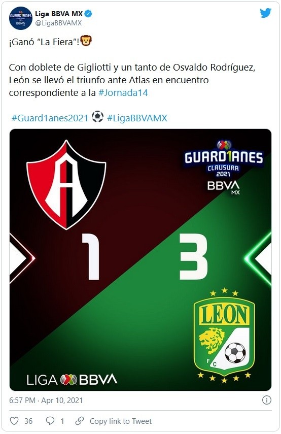 Cerca del final, al minuto 91, los Esmeraldas de León consiguieron hacer el tercer gol del partido por conducto de Osvaldo Rodríguez y fusilara a Camilo Vargas con un disparo potente a ras de pasto y cerrara prácticamente el partido con un 3-1 lapidario.Cuando Atlas más ímpetus iba a mostrar en el cierre del partido, cuando se había acercado en el marcador con un golazo de Édgar Zaldívar, llegó este gol del campeón para poner el último clavo en el ataúd rojinegro, que todavía busca acercarse en la pizarra.JM