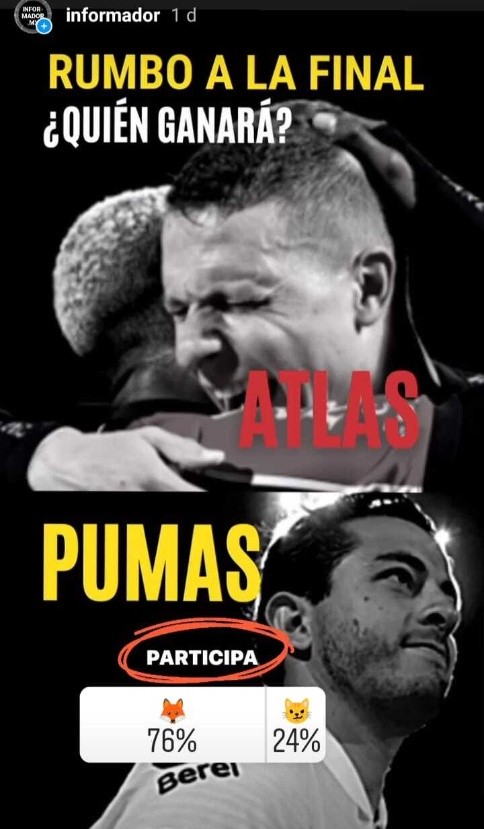 Dicen que la esperanza muere al último, y los seguidores de Atlas ven una alta probabilidad de que Los Zorros lleguen a la final, algo que no se ha visto desde 1999.A través de encuestas en redes sociales, EL INFORMADOR constató que el 76% de los seguidores creen que Atlas pasará a la final, ya que el gol de ventaja con el que llegan al encuentro de hoy les da esa certeza.Del mismo, de un total de cuatro mil 700 votantes, el 40% de los usuarios piensa que Atlas le ganará a Pumas, un 36% cree que perderá y un 24% pronostica un empate y, por lo tanto, su pase a la final por su gol de ventaja en el partido de ida.Mientras tanto, el primer finalista ya se concretó ayer con un dramático partido entre León contra Tigres, donde al final el pase se quedó a favor de los Esmeraldas.Así que en unas horas más veremos quién será el rival de León esta Gran Final, esto sabiendo que nuestros lectores han puesto toda su esperanza en los rojinegros.El partido será esta noche a las 19:00 horas en el Estadio Jalisco. Sigue nuestra cobertura al momento en nuestro sitio o en redes sociales twitter.com/informador_DEP y facebook.com/elinformador.deportes.Fecha y hora: Domingo 5 de diciembre, 19:00 horasTransmisión (canales): TUDN, Afizzionados, Azteca 7