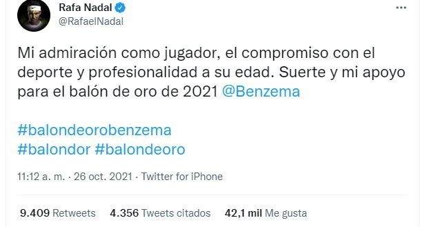 El tenista español Rafa Nadal mostró este martes su admiración por el delantero del Real Madrid Karim Benzema, mostrando su deseo de que el francés pueda alzarse con el Balón de Oro."Mi admiración como jugador, el compromiso con el deporte y profesionalidad a su edad", escribió Nadal, número cinco del mundo, en su cuenta oficial de Twitter."Suerte y mi apoyo para el Balón de Oro de 2021 @Benzema", concluyó el tenista español, hincha confeso del Real Madrid.No es la primera vez que Nadal y Benzema muestran su admiración mutua. En 2014, cuando Nadal ganó su noveno torneo de Roland Garros, Benzema felicitó al español en su redes sociales."Felicidades a este inmenso campeón que es Rafa!!! Felicitaciones por la novena ahora vamos a por la décima", escribió Benzema.Tres años más tarde, en mayo de 2017, Benzema celebró con Nadal la victoria de éste en el Masters 1000 de Madrid y un triunfo del Real Madrid en Sevilla, que le acercaba al título de Liga, que luego ganaría.El delantero merengue publicó entonces en sus redes una foto suya junto a Nadal con la leyenda en inglés "Tiempo de campeones!!! Felicidades Rafa Nadal".Benzema es uno de los aspirantes al Balón de Oro 2021, que recompensa anualmente al mejor futbolista del mundo.El delantero del Real Madrid, campeón con Francia en la Liga de Naciones de la UEFA, figura en la lista de 30 candidatos al Balón de Oro masculino, elegido por una selección de periodistas internacionales y que se concederá el 29 de noviembre.JL