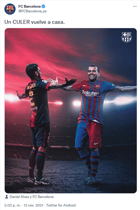 Esta mañana se había anunciado que una de las estrellas del Barcelona estaba a punto de regresar. Las redes sociales se movilizaron ante la información del diario Sport, que indicaba que ambas partes se encontraban en negociaciones. Más tarde, el propio equipo confirmó la vuelta de quien es uno de los jugadores más ganadores, Dani Alves."Un CULER vuelve a casa", anunció el equipo en sus redes sociales sobre el regreso del brasileño.En un comunicado, el Barcelona indicó que se llegó a un principio de acuerdo con el lateral izquierdo para su incorporación al primer equipo, por lo que queda de esta temporada. "El jugador brasileño se incorporará a los entrenamientos la próxima semana, pero no podrá debutar hasta enero".Adelantó que próximamente se darán los detalles de su presentación.El diario Sport había adelantado que el defensa sudamericano fue pedido por el recién anunciado técnico Xavi Hernández, pues lo quiere para su proyecto, en el que se busca devolver al equipo a la grandeza, tras un titubeante inicio de temporada.OF