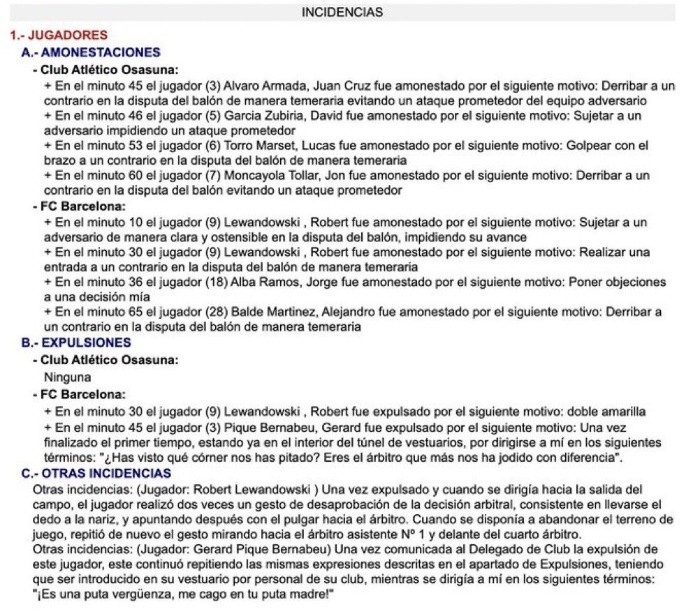 La carrera de Gerard Piqué llegó a su fin. Aunque al central del Barcelona aún le quedaba la oportunidad de jugar ante el Osasuna y posteriormente ante el Espanyol, el zaguero se fue expulsado al medio tiempo del partido ante los de Pamplona luego de insultar al árbitro. Robert Lewandowski se fue expulsado por Gil Manzano tras una doble amarilla y Gerard Piqué, quien estaba en la banca, explotó en contra del silbante. Fiel a su estilo, el catalán no tuvo reparo alguno en reclamarle airadamente al árbitro del partido. Tras recibir los insultos de Piqué, Manzano no dudó en mostrarle la cartulina roja. Según reveló en el acta arbitral Gil Manzano, Gerard Piqué le dijo "Eres el árbitro que más nos ha jodido con diferencia. ¡Es una p... vergüenza, me cago en tu p... madre!", lanzó el central. Gil Manzano castigó los insultos de Gerard Piqué con la tarjeta roja y el defensor del Barcelona no pudo tener actividad en el encuentro y tampoco estará ante el Espanyol en el Derbi catalán. Por ello, el último partido de Gerard Piqué en su carrera habrá sido ante el Almería en el Camp Nou, pues el propio futbolista tomó la decisión de retirarse de las canchas. JL