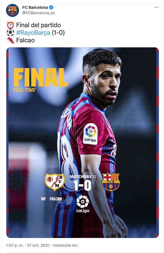 Con un gol del delantero colombiano Radamel Falcao a los 29 minutos, el Rayo Vallecano ganó este miércoles a un Barcelona que pudo empatar de penalti en la segunda parte, en partido de la J11 de LaLiga.El único gol del partido llegó tras un fallo en la salida de balón del Barcelona que propició una recuperación del mediapunta argentino Oscar Trejo. Este entregó el esférico al desmarque de Radamel Falcao, que se fue en velocidad de Gerard Piqué, le recortó en la carrera y cruzó ante Ter Stegen un disparo que tocó en el poste antes de alojarse en el fondo de la portería.Anteriormente, el mejor disparo de la primera parte también fue del Rayo con el mismo protagonista, Falcao, que recibió un balón en la frontal del área y lanzó un zurdazo que tocó en Piqué y se marchó a tiro de esquina cerca del poste derecho.En la segunda parte el Barcelona pudo empatar tras el penalti cometido por Oscar Valentín sobre Memphis Depay a los 71 minutos. El neerlandés cobró la pena máxima y el portero internacional macedonio Stole Dimitrievski adivinó la trayectoria hacía su poste derecho y detuvo el balón en dos tiempos.Con este resultado el Rayo Vallecano suma 19 puntos y sigue en la parte alta de la clasificación, mientras que el Barcelona, que encadena dos derrotas seguidas, se queda con 15.OF