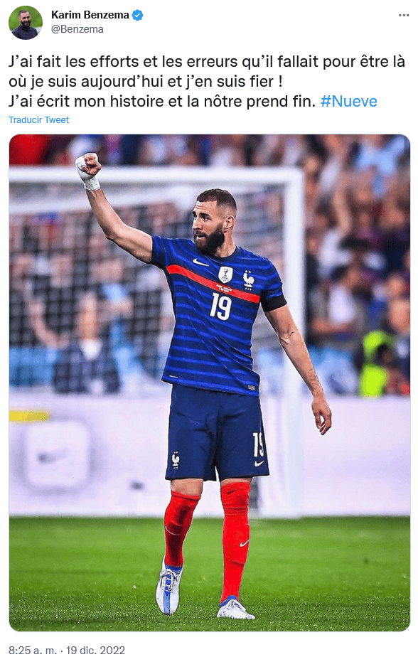 El atacante Karim Benzema anunció este lunes el "final" de su carrera en la Selección de Francia, en un mensaje publicado en Twitter, un día después de la final del Mundial de Qatar 2022 perdida por su país ante Argentina."He realizado los esfuerzos y he cometido los errores necesarios para estar donde estoy actualmente y estoy orgulloso de ello. He escrito mi historia y la nuestra finaliza", escribió en Twitter el Balón de Oro de 2022, que cumple 35 años este lunes, acompañando su mensaje de una foto suya con la camiseta de la Selección de Francia.Benzema había sido declarado baja por lesión para el Mundial a días del inicio del torneo, estando ya en Qatar, por un problema sufrido en un muslo durante un entrenamiento tres días antes del debut de Francia ante Australia. Su plazo de convalecencia había sido estimado en tres semanas por la Federación Francesa de futbol (FFF).Desde entonces alternó mensajes de ánimo en las redes sociales a los franceses con otros más enigmáticos, como el que publicó en Instagram antes de la final de la Copa del Mundo, donde escribió: "No me interesa".La lesión fue un capítulo más en su historia tormentosa con la selección. Pese a los 97 partidos disputados con Francia (37 tantos anotados), el exjugador del Lyon nunca llegó a brillar como "bleu". Solo logró un título importante con Francia, la Liga de Naciones de la UEFA de 2021, y de 2015 a 2021 estuvo apartado del equipo por su implicación en el 'caso sextape'.Por ese asunto fue condenado a un año de prisión, con cumplimiento de la pena en suspenso, y 75 mil euros de multa en primera instancia por el tribunal correccional de Versalles por complicidad en intento de chantaje por unos hechos que se remontan a 2015. Recurrió y debía haber sido juzgado una segunda vez el 30 de junio y el 1 de julio por el Tribunal de Apelación de Versalles, pero finalmente desistió.Había regresado por sorpresa al equipo nacional justo antes de la Eurocopa en 2021. En ese torneo, Francia decepcionó, quedando eliminada en octavos de final ante Suiza.OF