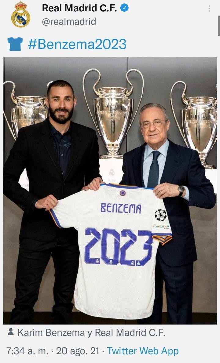 El Real Madrid confirmó mediante un comunicado oficial la renovación del delantero francés Karim Benzema por dos temporadas más, quien afirmó que es "un honor" seguir ligado al club."El Real Madrid CF y Karim Benzema han acordado la ampliación del contrato del jugador, que queda vinculado al club las dos próximas temporadas, hasta el 30 de junio de 2023", declaró el conjunto madrileño.Por su parte, el francés de 33 años, máximo goleador del Real Madrid la campaña pasada con 23 goles, publicó un mensaje a través de sus redes sociales: "La historia continúa para mí en el club más grande del mundo. Qué honor estar hoy aquí, gracias por la confianza que se ha depositado en mí durante tantos años ...""Never give up. ¡Hala Madrid!", añadió.Benzema comenzó la semana pasada su decimotercera temporada en el Real Madrid después de llegar en 2009 procedente del Olympique de Lyon por 36 millones de euros.Quinto máximo goleador histórico del Real Madrid con 281 goles -a nueve de Santillana y 27 de Di Stéfano- el francés se ha vestido de blanco en 560 ocasiones, es el décimo jugador con más encuentros del equipo, y ha conseguido levantar 19 títulos como madridista.Cuatro títulos de Champions League, cuatro del Mundial de Clubes, tres Supercopas de Europa, tres Supercopas de España, tres Ligas y dos Copas del Rey le avalan como uno de los grandes estandartes del conjunto madrileño.Karim Benzema se une así a la lista de jugadores que el Real Madrid ha renovado recientemente, entre los que se encuentran Luka Modric (hasta 2022), Lucas Vázquez (hasta 2024), Nacho Fernández (hasta 2023), Dani Carvajal (hasta 2025) y Thibaut Courtois (hasta 2026).¿Quieres saber más?Si quieres tener más contenido, más imágenes y aún más noticias, entonces descarga INFORMAPlus, la aplicación digital de EL INFORMADOR, donde tenemos materiales exclusivos para ti.Descarga la aplicación y pruébala GRATIS por treinta días.Si eres suscriptor de EL INFORMADOR tu acceso está incluido, solicítalo al 33 3678-7777OF