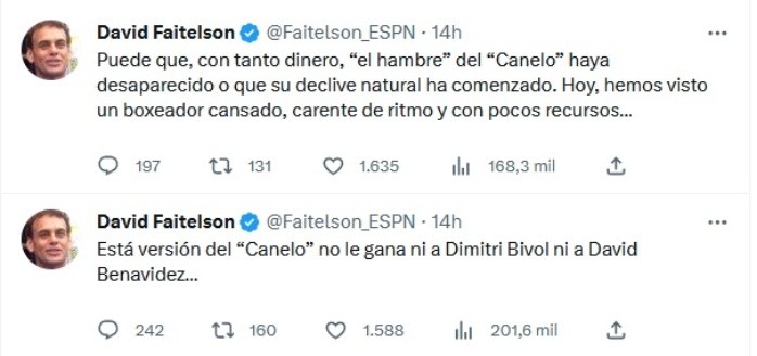 Saúl "Canelo" Álvarez se volvió a subir a un cuadrilátero frente a su público mexicano casi doce años después.El pugilista tapatío logró quedarse con el triunfo al derrotar, por decisión unánime, al inglés John Ryder en el Estadio Akron.Sin embargo, la actuación del mexicano no dejó satisfecho a David Faitelson, uno de los críticos más severos del campeón indiscutido de peso supermediano."Está versión del "Canelo" no le gana ni a Dimitri Bivol ni a David Benavidez…", sentenció a través de sus redes sociales al finalizar el combate.El periodista deportivo no sólo criticó el nivel mostrado por Saúl Álvarez sobre el ring ante Ryder, también cuestionó su anhelo de seguir peleando."Puede que, con tanto dinero, "el hambre" del "Canelo" haya desaparecido o que su declive natural ha comenzado. Hoy, hemos visto un boxeador cansado, carente de ritmo y con pocos recursos…", puntualizó.JM