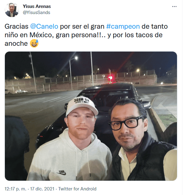 El boxeador jalisciense Saúl "Canelo" Álvarez "noqueó" a su hambre al visitar una taquería para cenar junto con algunos miembros de su equipo de trabajo. Pero el boxeador no solo sorprendió a los comensales por su llegada al lugar, sino también por un detalle que tuvo con todos los presentes.En redes sociales comenzó a circular una imagen donde el usuario @YisusSands le agradece al boxeador por la foto que se tomó con él a la salida del establecimiento, y por invitar los tacos.De acuerdo con el sitio Players of Life el "Canelo" Álvarez fue captado en una taquería que está ubicada en el municipio de Tlajomulco de Zúñiga, Jalisco.Una vez que "Canelo" Álvarez pidió su orden, pagó la cuenta de todos los que se encontraban en el lugar.Al final, el pugilista se dio el tiempo para tomarse fotos tanto con los trabajadores del sitio, como con las personas que se encontraban cenando.OF