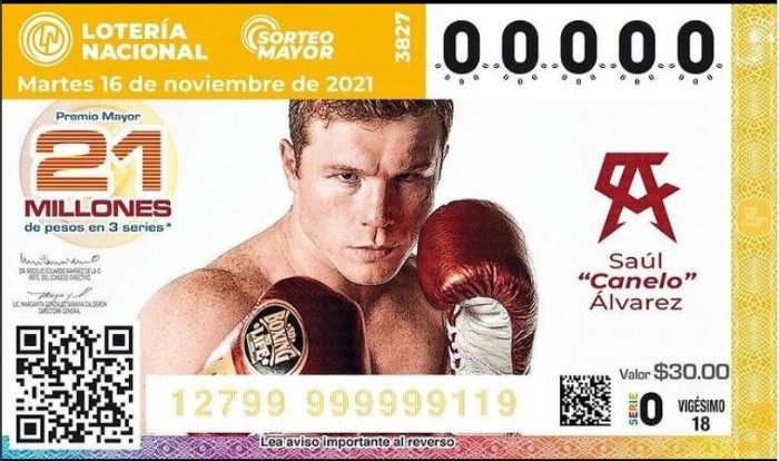 Saúl "Canelo" Álvarez está en boca de todos tras vencer a Caleb Plant y unificar los 4 cinturones de los organismos que rigen el boxeo profesional, en la categoría del peso supermediano. Ante el estadounidense, el tapatío dio una exhibición de su calidad boxística y provocó que todo mundo hable de él.Incluso afuera del ring, "Canelo" sigue dando de qué hablar y es que a través de redes sociales, el pugilista mexicano anunció que tendrá su propio billete de la Lotería Nacional; el gran sorteo se llevará a cabo el próximo martes 16 de noviembre. Además de compartir el "cachito" que llevará una imagen suya con los guantes puestos, Saúl "Canelo" Álvarez invitó a la gente a que adquiera sus boletos y participe en el sorteo, cuyo gran premio será de 21 millones de pesos. “Tú también sé un ganador y compra tus cachitos del #SorteoMayor de @lotenal del próximo martes 16 de noviembre. ¡El premio mayor es de 21 millones de pesos!”, escribió.La publicación fue bien recibida por sus fans, quienes consideraron que el gesto de la Lotería Nacional al colocar la imagen del "Canelo" es un merecido homenaje a la carrera del boxeador tapatío. JL