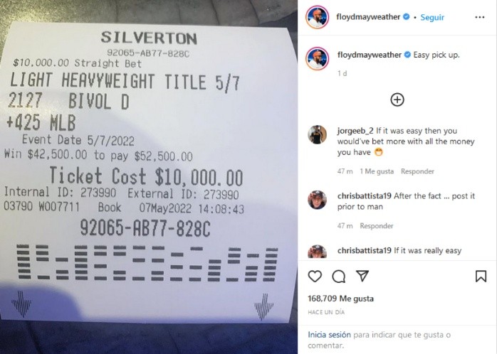 El mexicano Saúl "Canelo" Álvarez perdió por decisión unánime ante el ruso Dmitry Bivol en la T-Mobile Arena el pasado sábado 7 de mayo, pero si bien su derrota dejó con mal sabor de boca a muchos, otros se beneficiaron, como el ex boxeador Floyd Mayweather.El estadounidense presumió en su cuenta de Instagram el ticket de la apuesta que aseguró ganó de manera "fácil".Floyd Mayweather Jr. se llevó 10 mil dólares, poco más de 200 mil pesos, gracias al triunfo de Dmitry Bivol en Las Vegas.Sin duda, estas ganancias saben aún mejor para Mayweather Jr., pues fue el primer boxeador en vencer al mexicano y después de eso la relación entre ambos púgiles se tensó y son constantes las críticas y burlas del estadounidense.El sábado por la noche, tras anunciarse la decisión, "Canelo" apuntó que está dispuesto a una revancha con Bivol, mientras que el ganador de la pelea en la Arena T-Mobile de las Vegas señaló que el mexicano es el peleador más grande del mundo y ahora, al ser el campeón analizará un segundo capítulo porque debe asegurarse que reciba lo que merece. El récord del "Canelo" Álvarez queda en 57 victorias por dos derrotas.OF