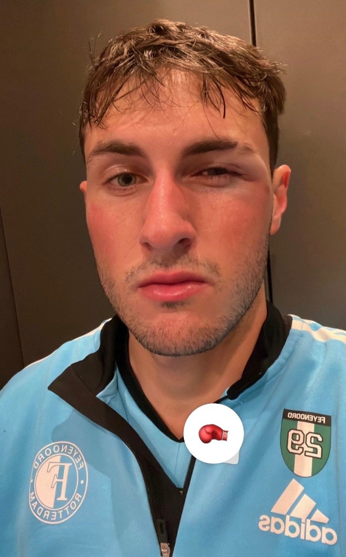 Santiago Giménez apareció en sus redes sociales con una foto en la que muestra cómo le quedó el rostro luego de que sufriera un fuerte golpe durante el entrenamiento. Tras la polémica que protagonizó el Canelo Álvarez las últimas semanas tras amenazar a Lionel Messi por patear la playera de la Selección Mexicana, el mismo Santi y sus compañeros vacilaron con que el delantero decidió defender al astro argentino y por ello terminó así. Fue en Instagram donde Santiago Giménez compartió una foto de su cara, donde se aprecia su ojo hinchado tras recibir un fuerte golpe. En la misma red social, el delantero del Feyenoord puso un video en donde uno de sus compañeros bromea insinuándole que por defender a Messi del Canelo terminó así. En la grabación se aprecia como su compañero Marcos López le dice "¿Qué pasó hermanito, te agarró Canelo?", mientras el propio Santi Giménez bromea "Quise defender a Messi", desatando las risas de sus compañeros. Tras compartir la imagen también en Twitter, los comentarios no se han hecho esperar y la mayoría de ellos acusa al Canelo de haberlo golpeado. "Dejaste la camisa de Mexico en el piso???", "Creí que el Canelo tenía bronca con Messi y no contigo", "De seguro se te cayó una moneda del lado del escudo de la bandera y te vio el Canelo, ¿Verdad?", son solo algunos de los comentarios que ha desatado la foto de Santiago Giménez golpeado. JL