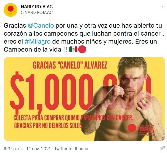 El boxeador tapatío Saúl "Canelo" Álvarez donó un millón de pesos para apoyar a niños con cáncer.El apoyo lo realizó a Nariz Roja, asociación encargada de proporcionar quimioterapias a los menores que la necesitan."Gracias Canelo por una y otra vez que has abierto tu corazón a los campeones que luchan contra el cáncer", escribió la asociación en su cuenta de Twitter.Además calificaron al boxeador mexicano como "el milagro de muchos niños y mujeres. Eres un campeón de la vida".La última pelea de Álvarez fue el pasado 6 de noviembre, cuando derrotó a Caleb Plant y se convirtió en el primer boxeador de todos los tiempos en unificar los cuatro cetros de las 168 libras.IM