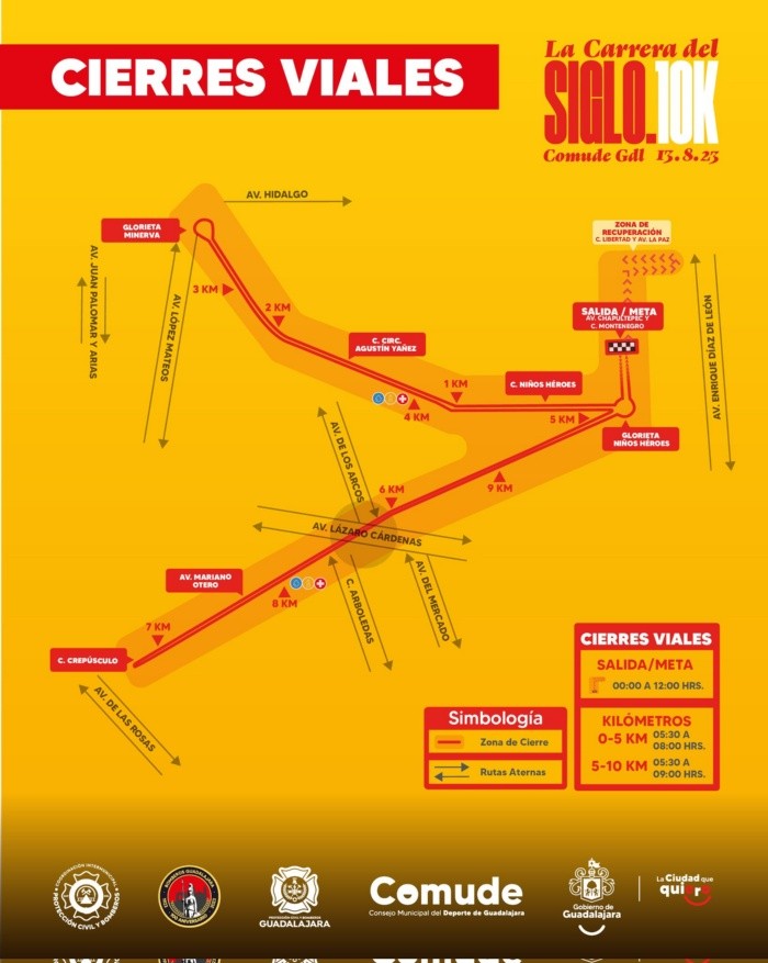Comienza la cuenta regresiva para la llamada Carrera del Siglo 10 K la cual se llevará a cabo el próximo domingo 13 de agosto sobre las principales calles de la Perla Tapatía.En este evento, en el cual se conmemora el primer centenario de la fundación de bomberos de Guadalajara, se espera la participación de 20 mil corredores, por lo que sin duda será toda fiesta deportiva.Para la carrera del Siglo 10 K se han anunciado una serie de cierres viales, por lo que si tu eres de los que tienes que ir a trabajar en domingo por la mañana o tienes algún tipo de compromiso por la zona es importante que tomes a consideración la ruta por dónde pasarán los atletas. La salida y meta será sobre Chapultepec y Montenegro, este punto estará cerrado desde las 00:00 horas del domingo y hasta las 12:00 horas del mismo domingo.Ahí se dará el disparo de salida a las 6 de la mañana, por lo que los corredores tomarán Niños Héroes, luego Agustín Yánez rumbo a La Minerva, de ahí rodearán la glorieta y regresarán de igual forma por Agustín Yáñez y luego Niños Héroes para después tomar Mariano Otero, hasta la calle de Crespúsculo y regresar en U por Mariano Otero rumbo a Chapultepec y Montenegro, donde estará la meta. Para evitar ser víctima del tráfico vehicular podrá tomar las siguientes vías alternar. io