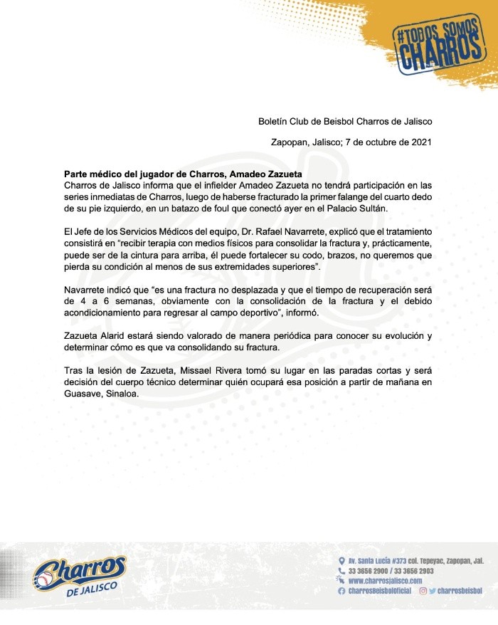 Apenas habían comenzando bien la temporada y para Charros de Jalisco llegó una mala noticia. El infielder Amazeo Zazueta causará baja cerca de seis semanas debido a una fractura sufrida ante Sultanes en Monterrey.La lesión de Zazueta fue en el primer falange del cuarto dedo de su pie izquierdo y según Rafael Navarrete, jefe de los Servicios Médicos de Charros, el tratamiento a seguir del pelotero de la novena jalisciense será “recibir terapia con medios físicos para consolidar la fractura y, prácticamente, puede ser de la cintura para arriba, él puede fortalecer su codo, brazos, no queremos que pierda su condición al menos de sus extremidades superiores”.Navarrete indicó que “es una fractura no desplazada y que el tiempo de recuperación será de 4 a 6 semanas, obviamente con la consolidación de la fractura y el debido acondicionamiento para regresar al campo deportivo”, informó para el club blaquiazul.Tras la lesión de Zazueta, Missael Rivera tomó su lugar en las paradas cortas y será decisión del cuerpo técnico determinar quién ocupará esa posición a partir de mañana en Guasave, Sinaloa, según informaron los Charros en un comunicado oficial. JL