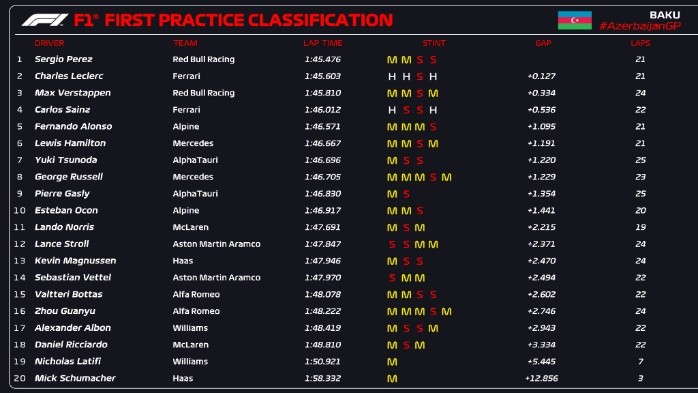 El mexicano Sergio "Checo" Pérez, que ganó hace dos semanas del Gran Premio de Mónaco 2022, firmó este viernes el mejor tiempo en la primera sesión de ensayos libres del Gran Premio de Azerbaiyán, la octava carrera del Mundial de Fórmula 1 (F1).Al volante de su Red Bull sobre las calles de Bakú, "Checo" Pérez cubrió la mejor vuelta en un minuto, 45 segundos y 476 milésimas, por delante del monegasco Charles Leclerc (Ferrari), que quedó a poco más de una décima de segundo (+0.127).El tercer tiempo de esta primera sesión fue para el neerlandés Max Verstappen, vigente campeón mundial y actual líder en la clasificación del campeonato, que quedó a tres décimas de su compañero de equipo que dominó, "Checo" Pérez.El cuarto tiempo de la sesión fue para el español Carlos Sainz Jr. (Ferrari), a medio segundo del mexicano.Por detrás de los Red Bull y los dos Ferrari, los otros coches fueron relegados a más de un segundo.OF