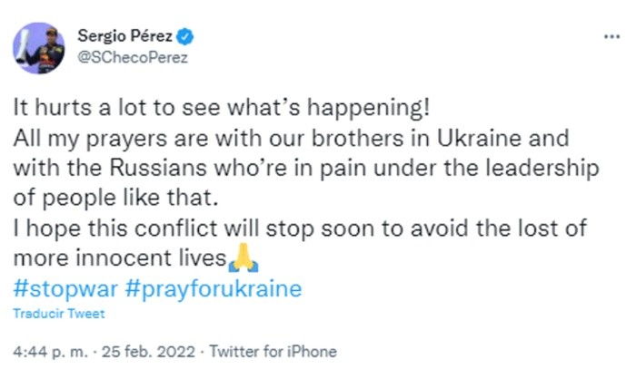 El piloto tapatío de F1, Sergio "Checo" Pérez, utilizó sus redes sociales para expresar su opinión sobre la situación que atraviesa Ucrania por los ataques de Rusia."¡Duele mucho ver lo que está pasando!", aseguró el tapatío.El piloto de la escudería Red Bull consideró que la población rusa no es el actor principal en estos hechos."Todas mis oraciones están con nuestros hermanos en Ucrania y con los rusos que sufren bajo el liderazgo de personas así", escribió en su cuenta de Twitter.La F1 anunció ayer viernes la cancelación del Gran Premio de Rusia debido al problema político, mismo que "Checo" espera termine lo antes posible."Espero que este conflicto se detenga pronto para evitar la pérdida de más vidas inocentes".OF
