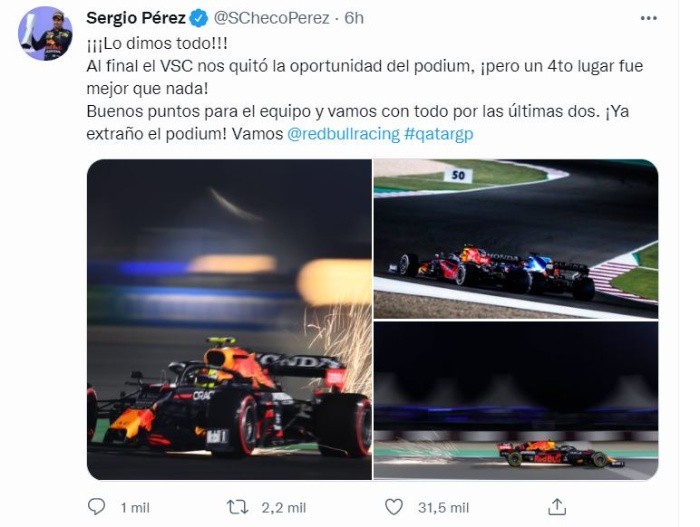 El piloto mexicano de Red Bull, Sergio "Checo" Pérez, finalizó en la cuarta posición el Gran Premio de Qatar, antepenúltimo de la temporada de Fórmula Uno y aseguró que, aunque tuvo muy "cerca el podio", "desgraciadamente no funcionó".El tapatío había tenido una gran recuperación, luego de haber sido eliminado en la Q2 el sábado, pues de arrancar en la onceava posición, terminó por colarse en el cuarto sitio. Sin embargo, "Checo" quería más."Nos pudimos recuperar de la calificación y pudimos avanzar mucho desde la undécima plaza; por lo que estábamos en una muy buena posición para estar en el podio, pero desafortunadamente no funcionó", comentó el mexicano. Sobre la carrera, Sergio Pérez aseguró que el arrancar desde el undécimo puesto, hizo que terminara agotado, pues estuvo conduciendo siempre al máximo. Además, señaló que algunos incidentes dentro de la pista, provocaron que cambiara su estrategia en beneficio del equipo. "Ha sido una carrera muy agotadora, estuve todo el tiempo a tope, adelantando y apretando. Cambiamos nuestra estrategia a lo largo de la carrera; en algunas fase íbamos a hacer una parada y en otras dos, pero los neumáticos de otros explotaban, así que tuvimos que proteger los nuestros para evitar pinchazos y maximizar nuestra posición en el Mundial de constructores", indicó el tapatío. Ya entrando en detalles, Sergio Pérez no se cortó y acusó que uno de los factores que le impidieron llegar al podio fue el VSC (Virtual Safety Car). "Creo que teníamos el podio en el bolsillo, pero por segunda semana un coche de seguridad virtual nos ha costado potencialmente. No sé si sin él definitivamente hubiéramos alcanzado a Fernando, pero hubiéramos estado cerca", opinó.Finalmente, el piloto de Red Bull se mostró ansioso por las dos últimas carreras, en las cuales buscará un gran resultado para el Campeonato de Constructores y además, solo 13 puntos lo alejan del tercer sitio de Valtteri Bottas en el campeonato de Pilotos, por lo que la posibilidad lo hace soñar."Ahora estoy deseando que llegue Arabia Saudita y Abu Dhabi porque vamos a darlo todo, tenemos una gran oportunidad de llegar a la cima del Campeonato de Constructores, hay cinco puntos en él, es todo por jugar y ese es el objetivo", concluyó 'Checo' después de acabar cuarto en Losail. JL